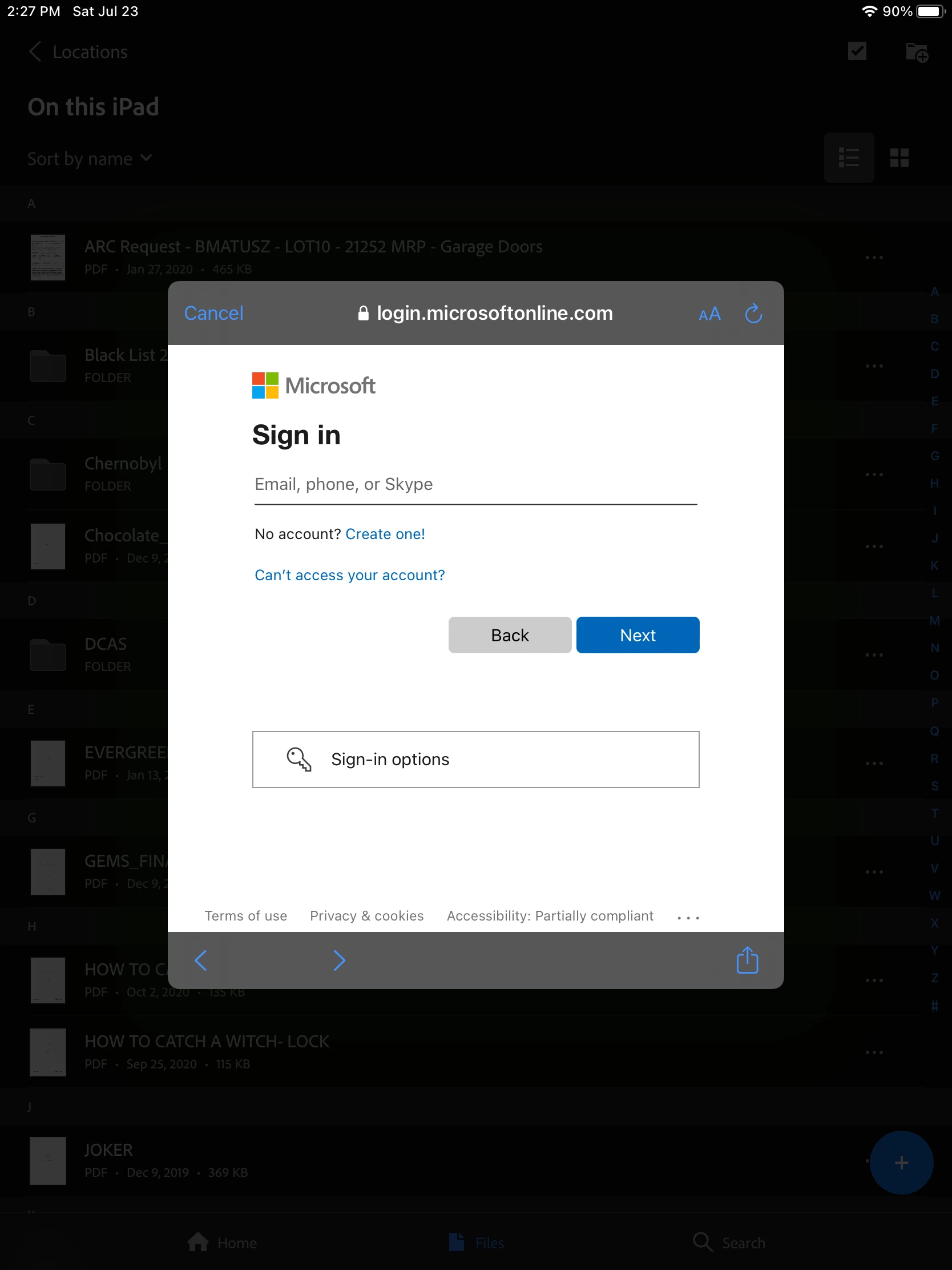 Acrobat on iPad prompts me to sign in to my existing OneDrive account and does not present me with a keyboard to type the email or password. This makes Acrobat useless to me as I have tons of PDF's stored there.