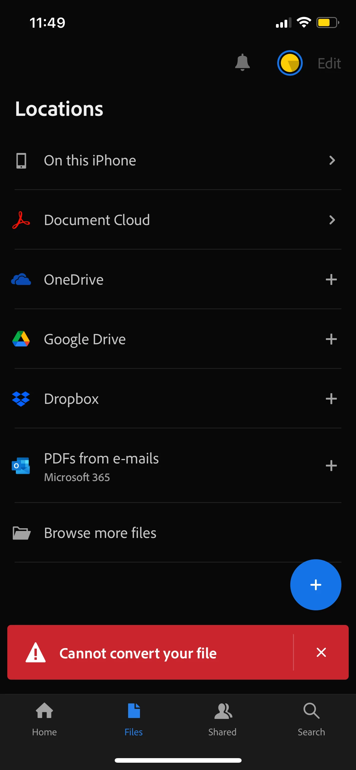 I was working on my reports on my ipad (combining pdf files) and an error appeared. I am subscribed to premium. Tried to redownload the excel files I am working on, reinstall the app, reset the app but nothing works. Tried it on my iphone but still not working. (**Please see attached pictures for reference**)
