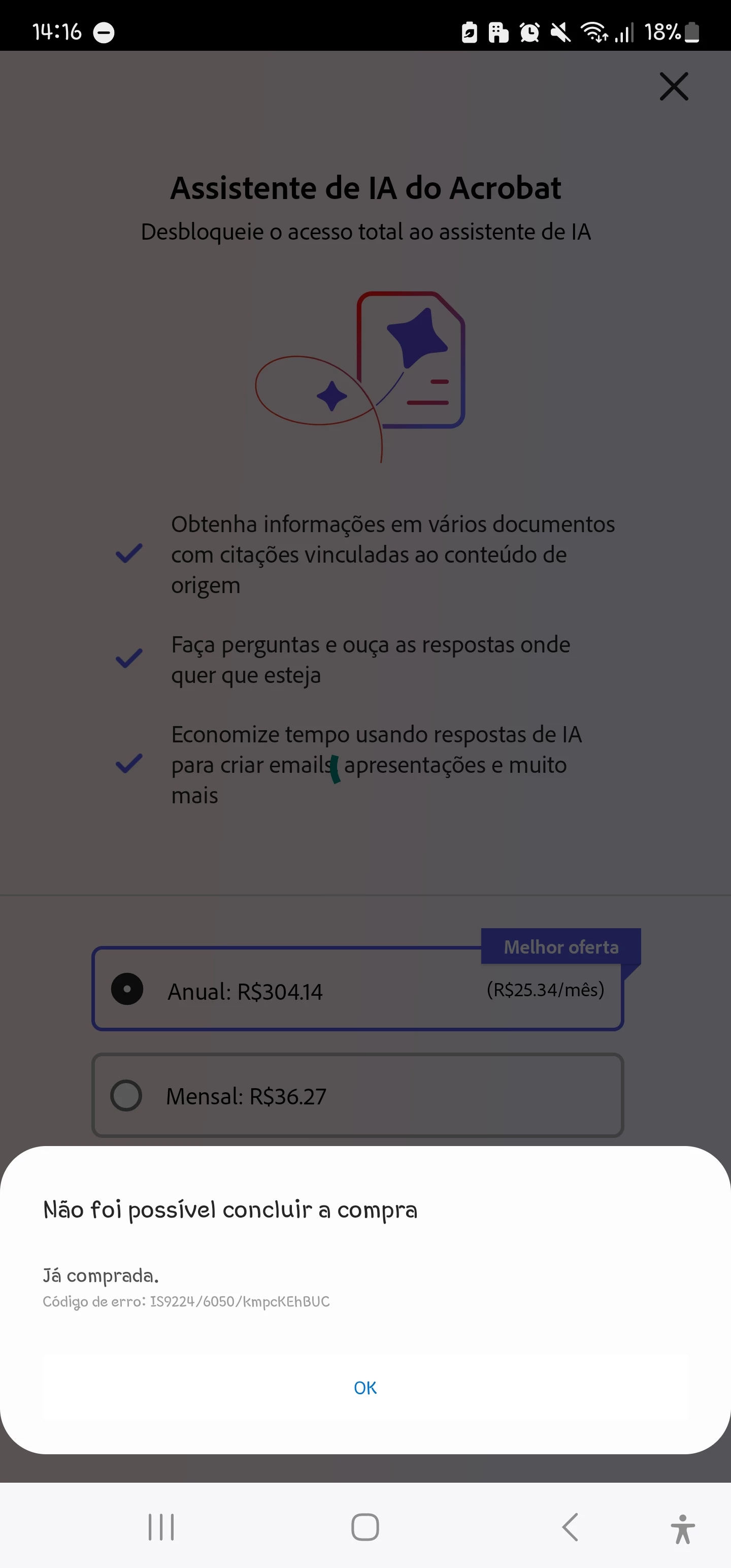 Assinei a IA para Adobe, mas a mesma não é liberada no app. Fica solicitando compra novamente. Mesmo clicando para comprar novamente aparece que a compra já foi feita.