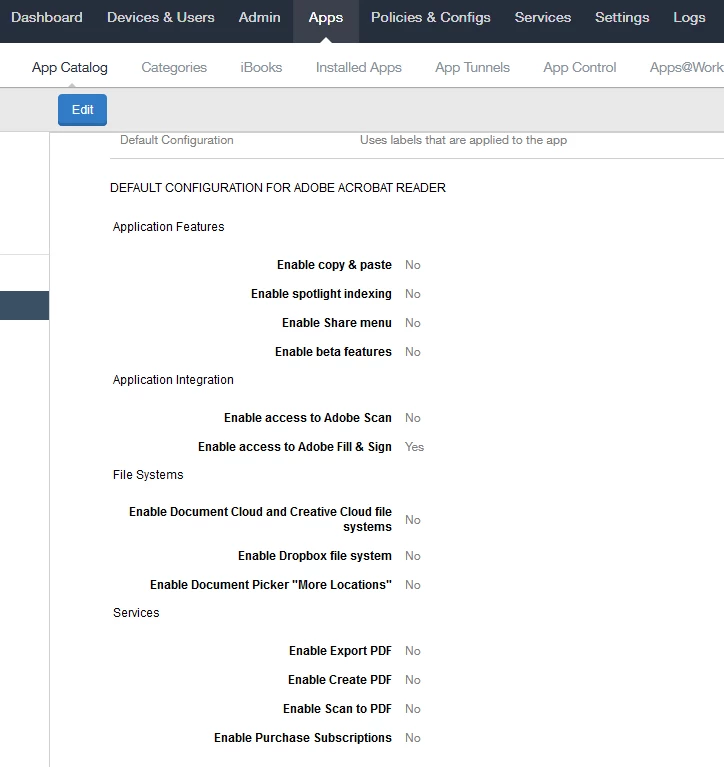 Reading the enterprise guide pasted below and browsing the forums, I am discovering that the app configuration for Acrobat Reader in MobileIron Core is no longer working or supported (until 2019). Is this still true? If so, is there any other way to configure these settings in MobileIron Core?