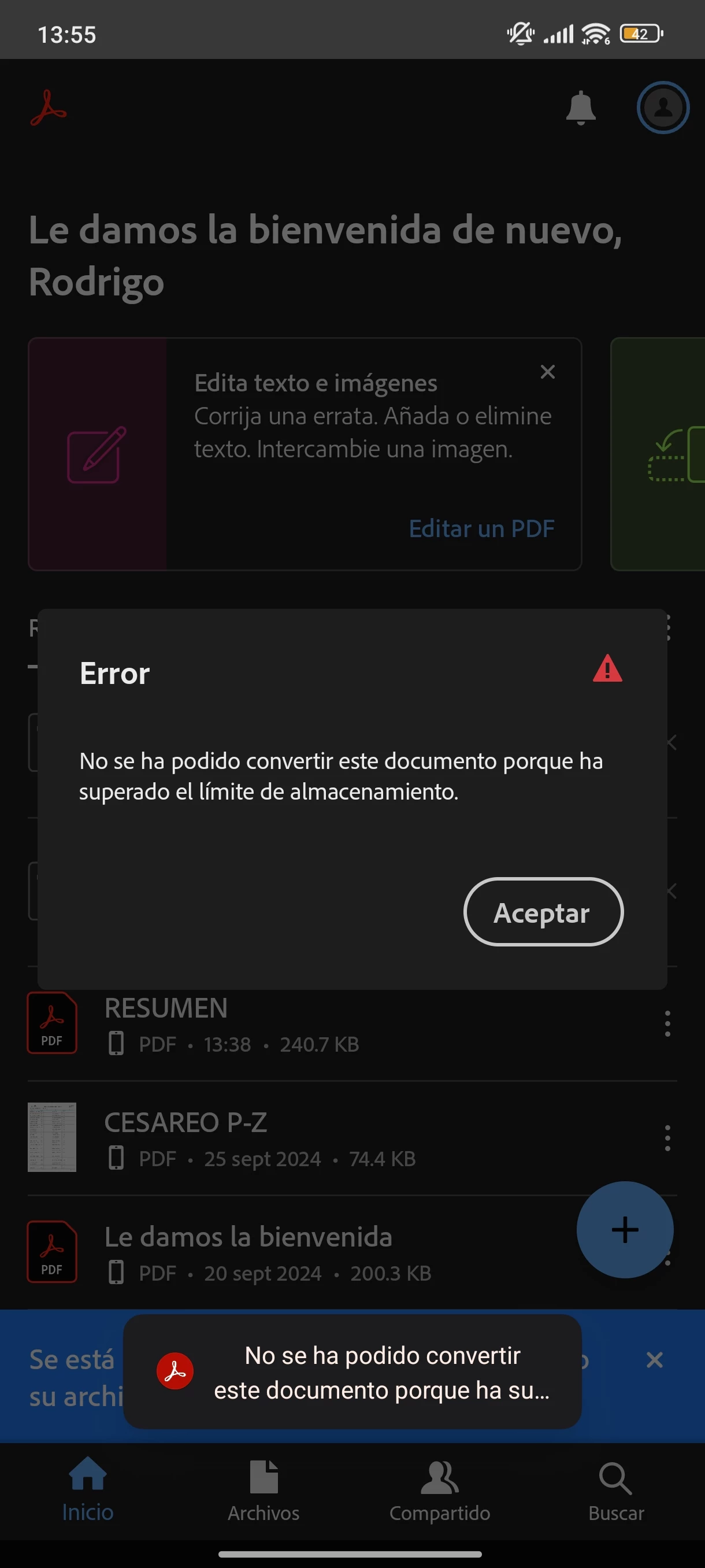 It appears that you've reached your storage limit on Adobe Document Cloud, which may be affecting your ability to upload or sync files.