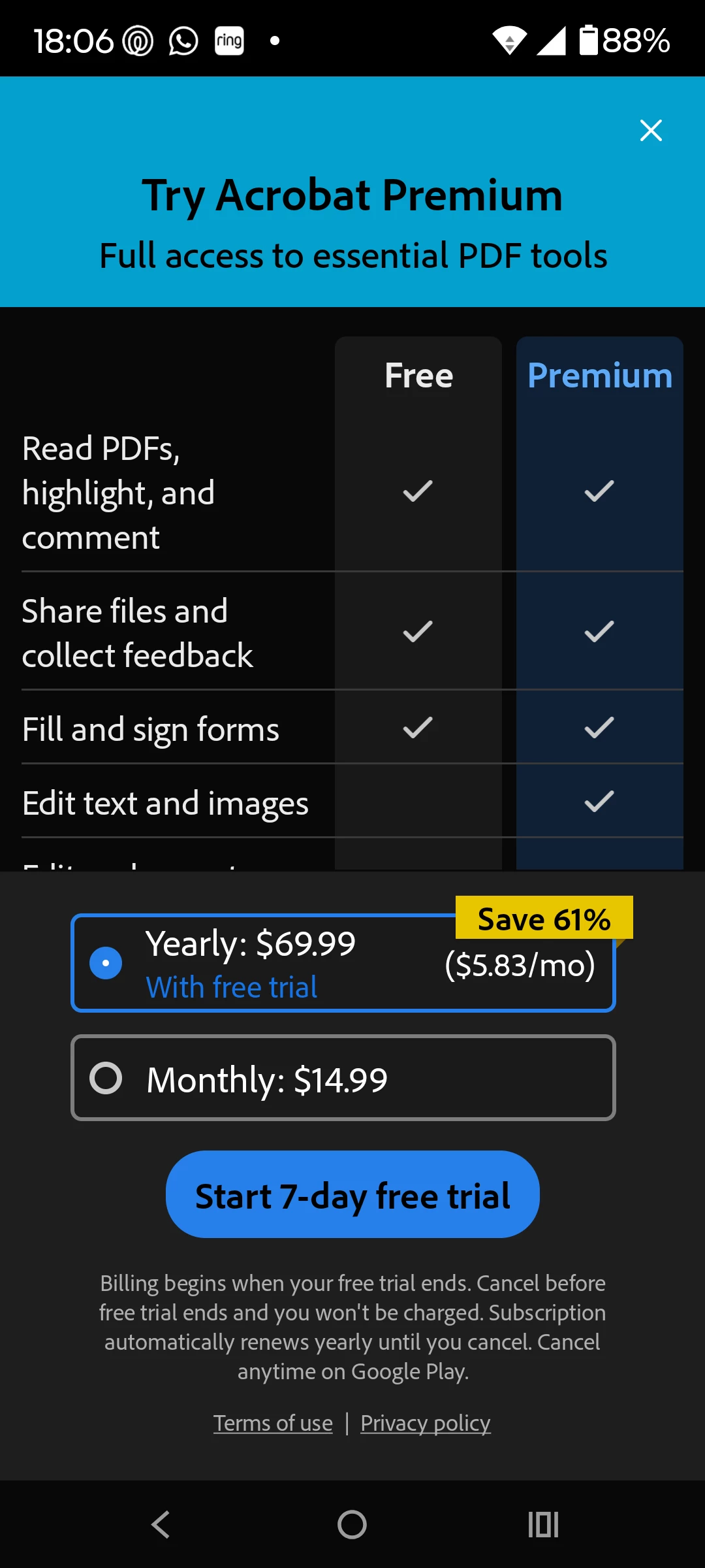 Really frustrated. I have had Adobe Acrobat on all of my mobile devices for decades. I just deleted them all! I'm not sure what has changed but I can no longer open the app without getting a full page add for purchasing paid services. I suppose that my email address and personal information is no longer enough! Adobe has to have my bank account as well! Sorry, but I'll find another app to open my PDF documents....like M365!