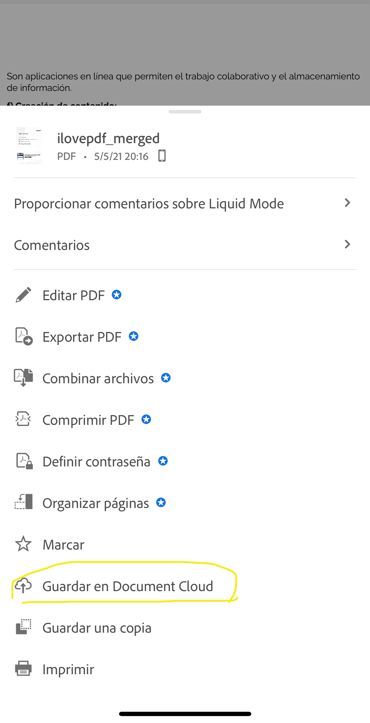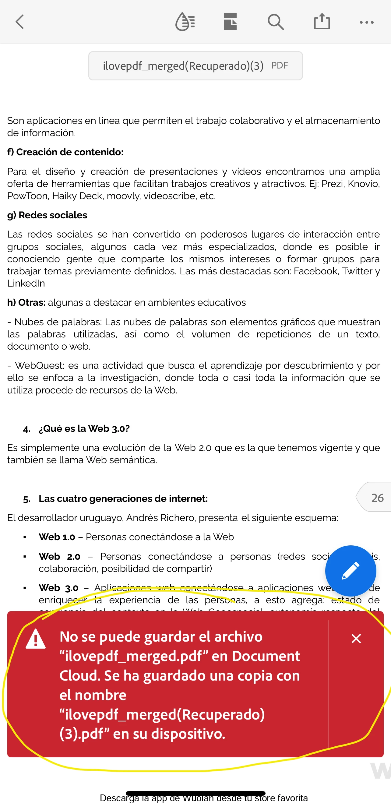 Cuando intento subir un documento a la nube me indica que no se ha podido y me crea otro documento con la coletilla recuperado, pero en document cloud no está.