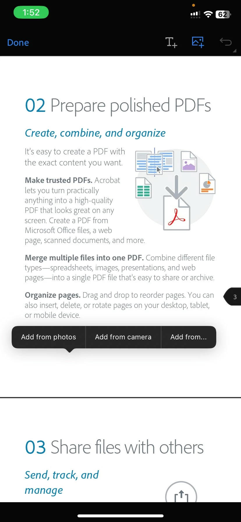 I have an iphone and an ipad but my business requires me to be able to fully fill out fillable PDFs on a hand held device. On IOS, reader does not allow you to insert or add photos from the camera or gallery to the PDF.