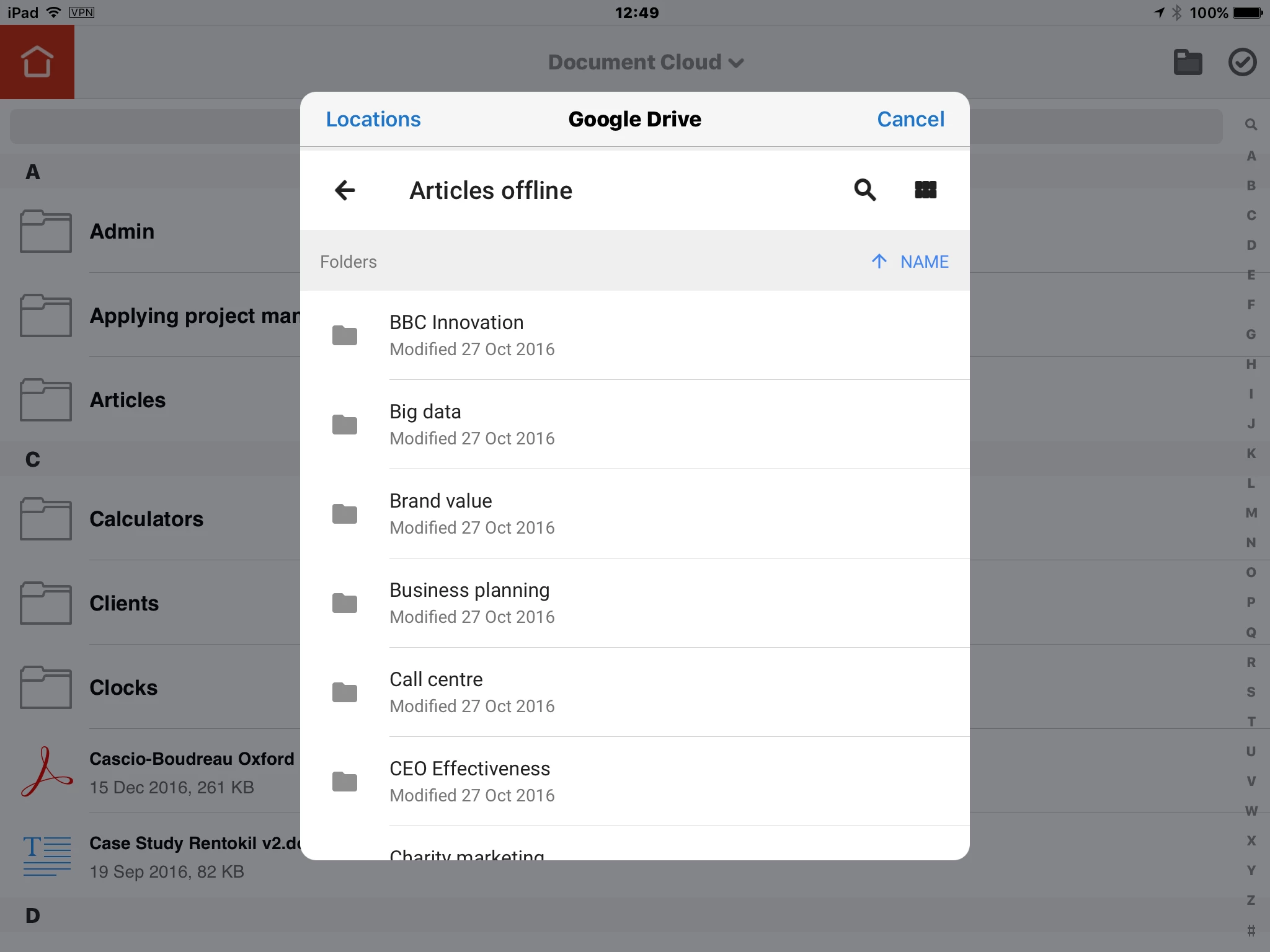 My iPad (IOS 10.2, Adobe Acrobat 16.12.15) says that it can't access the Document Cloud (see image below) but at the same time has no trouble accessing other online services like Google Drive (see second image below). In other words, my iPad is clearly online.