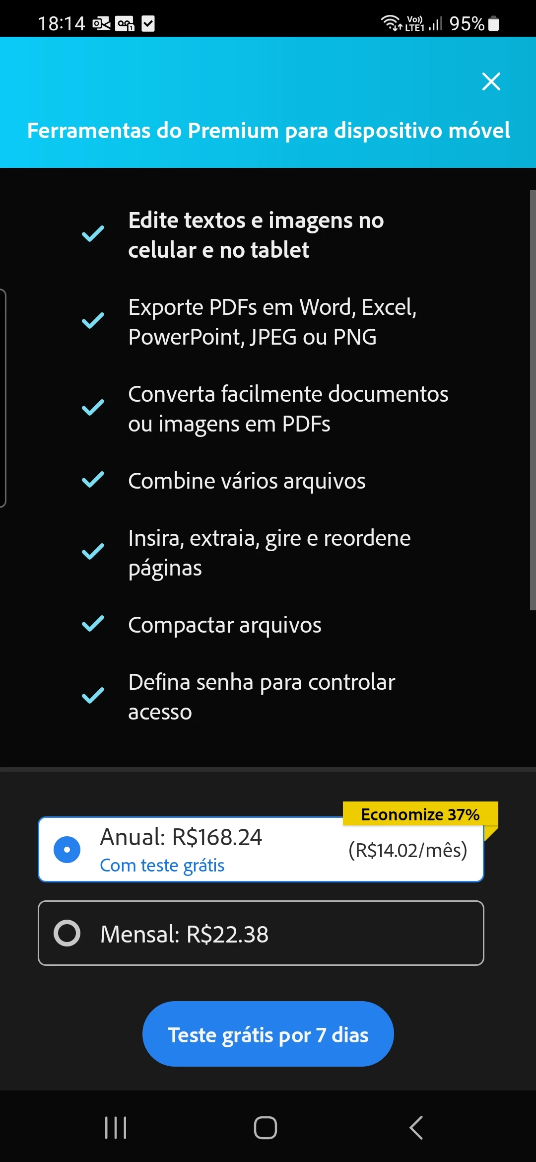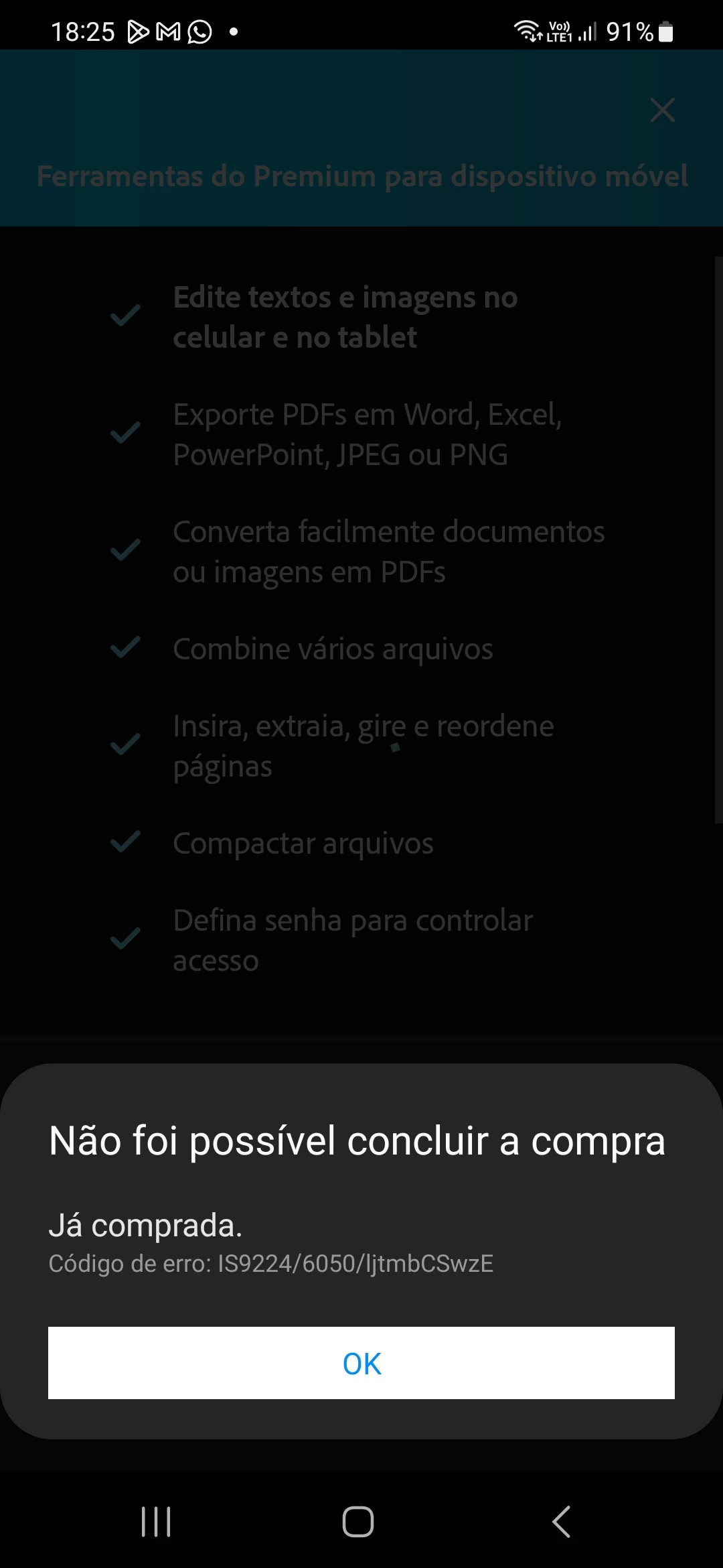 Comprei o pacote anual para as ferramentas premium para dispositivos móveis do adobe acrobat for samsung e os mesmos não foram liberados. Nem durante o período de teste, nem depois de pago tive os recursos liberados. Gostaria de uma solução, caso não se resolva que seja feito o estorno do valor cobrado. Se resolver, também quero que os dias em que não tive a oportunidade de utilizar os resursos sejam disponibilizados.