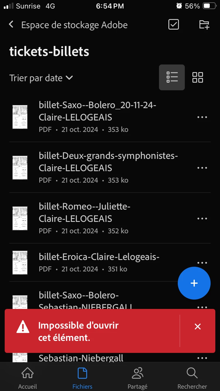 Files on the creative cloud are not avaiable on acrobat, always returning an error message without details. When going through creative cloud app I can find and download them.