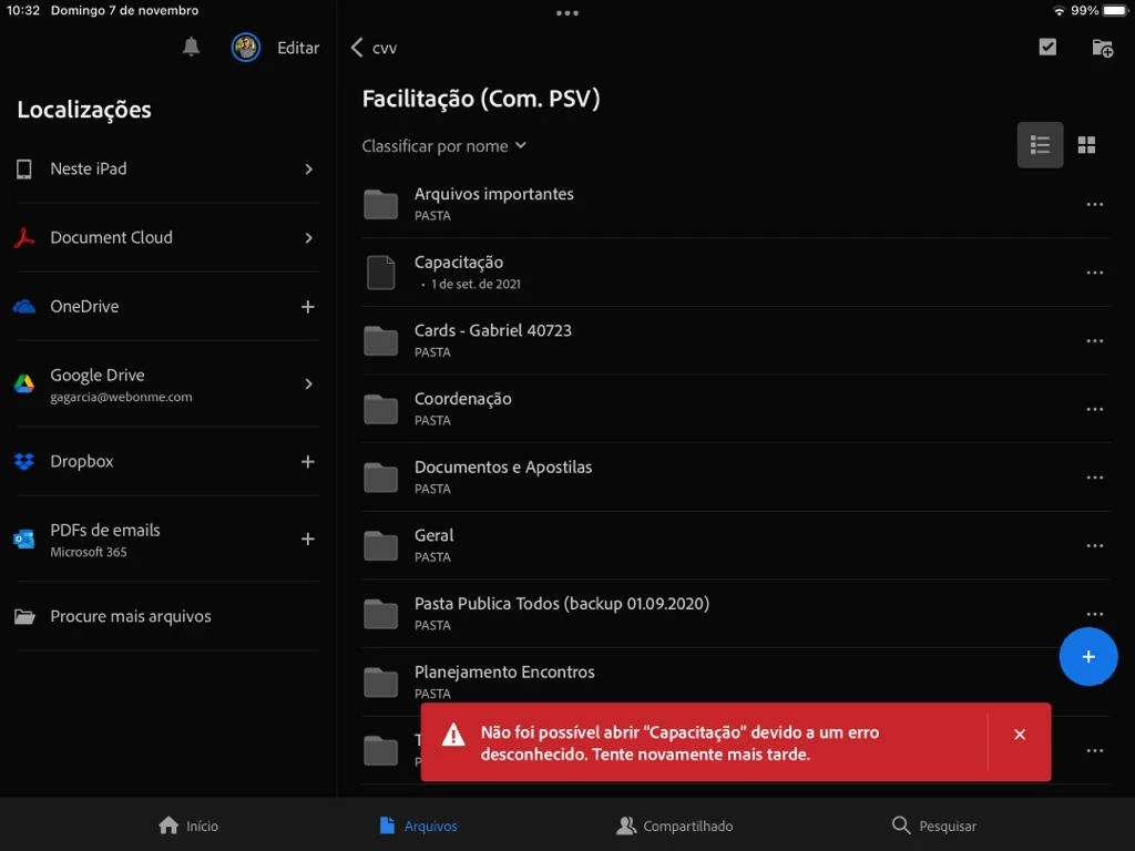 it shows me: "Não foi possível abrir xxx devido a um erro desconhecido. Tente novamente mais tarde." / Could not open xxx due to an unknown error. Please try again later.