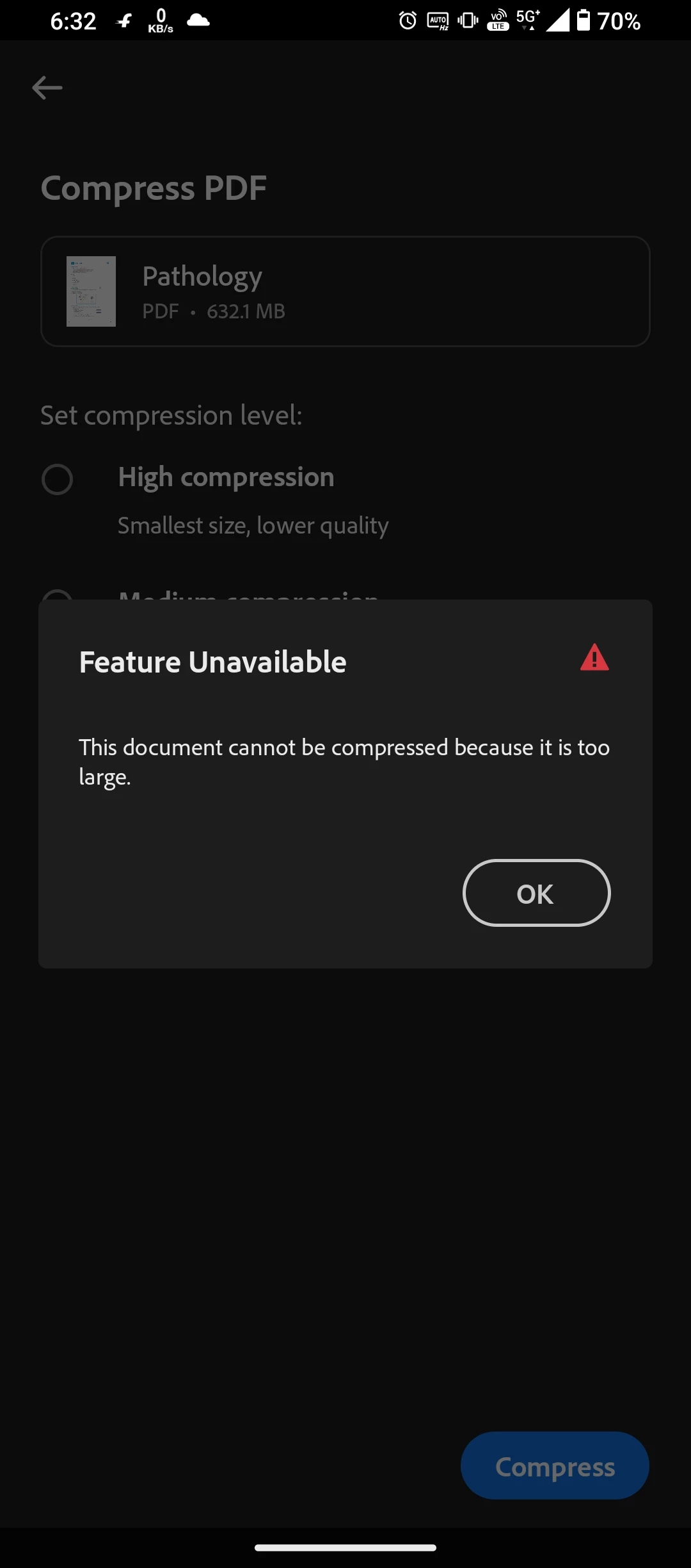 I tried to compress pdf file size 800 mb. But cannot. The acrobat seems to work on it and then gone like nothing happen.