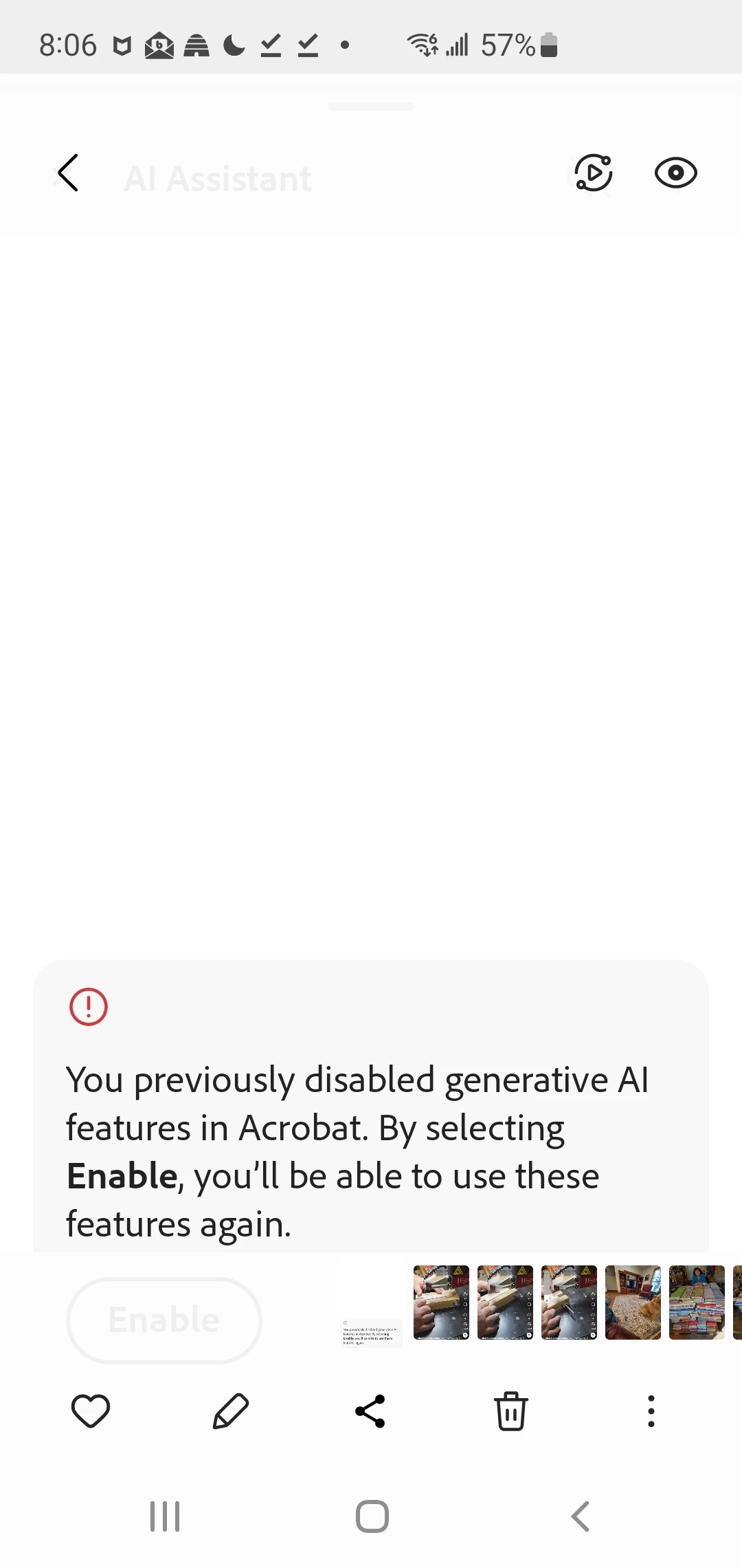 Running iOS 18.3.1, and there is no "Enable generative AI features in Acrobat" slider button, or even a "GENERATIVE AI FEATURES IN ACROBAT" section under preferences. Likely due to my iPhone being subjected to company management, and the admins have seen fit to turn on Generative AI and not allow users to turn it off. My only use of Acrobat on iOS is as a reader, and as has been noted in this or other threads on the issue, the intrusive Generative AI popup chews up valuable screen real estate on an iPhone screen.