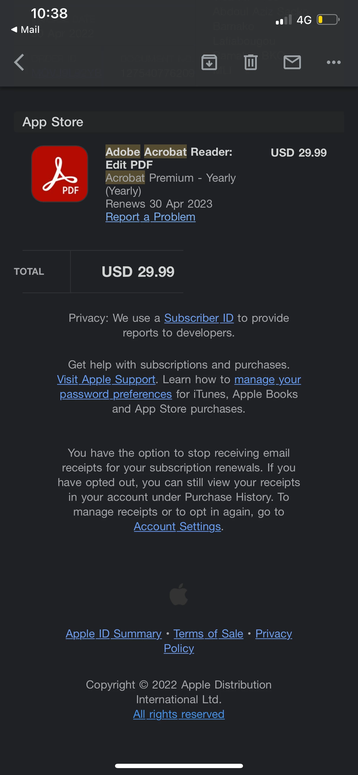 Hi I'm Abdoul Aziz Sacko from mali. I have subscribed to adobe reader for one year at first time for 29$ some months later I could not use it to edit a docs. And I subscribed for second time for one month that month has finished 10th July. And the one year should finish in April 2023 but still I can use it to edit docs