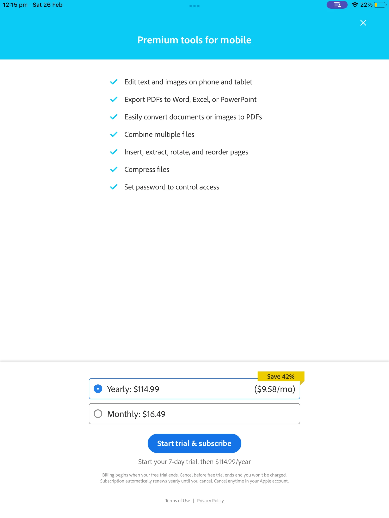 I've paid for subscription twice on my iPad for adobe pdf edit, I've already spoke to apple,I've deleted and reinstalled the application and it keeps prompting me to gets free trail, and then it asks me to"try now and it doesn't work, the whole application won't work and I don't know what to do.please help me.