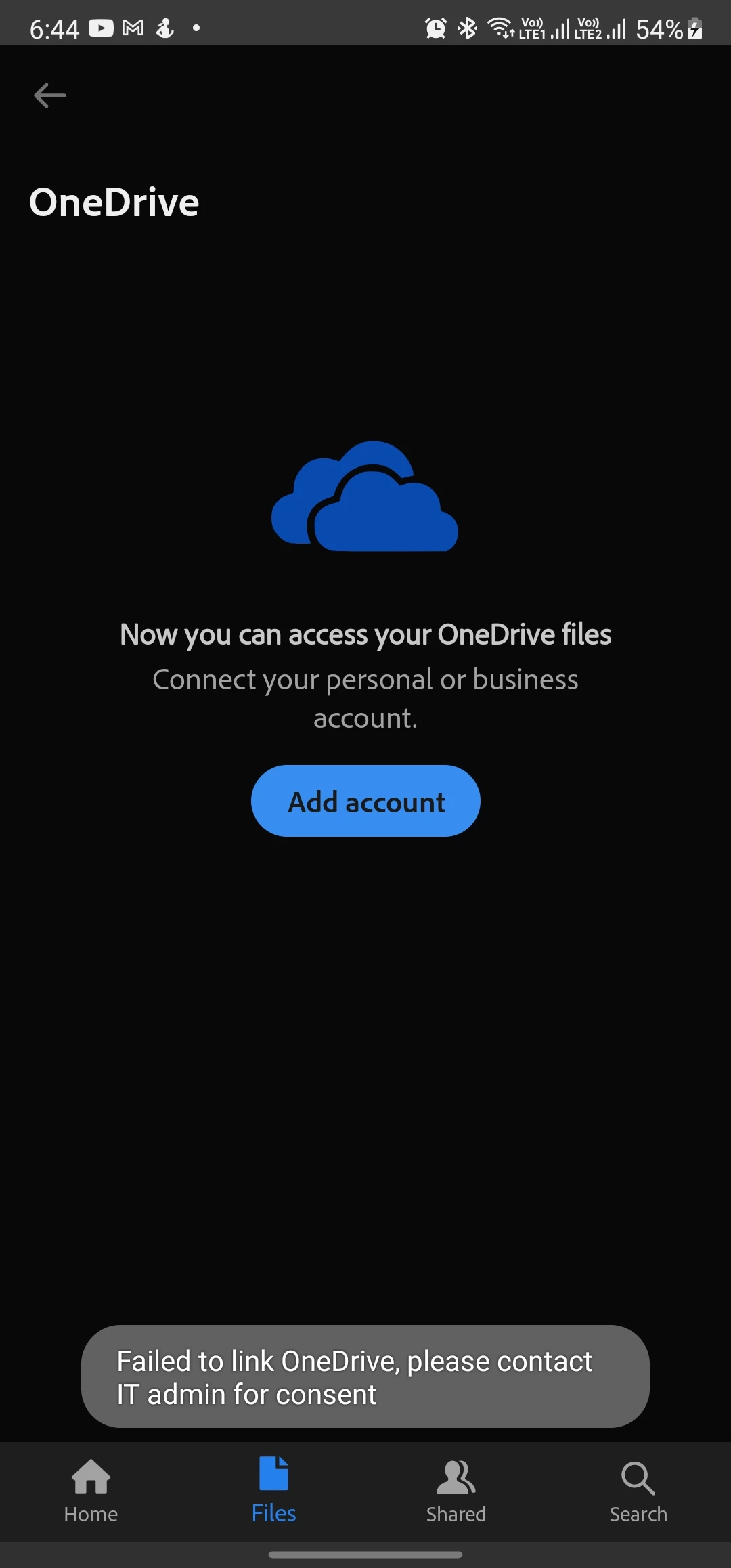 When i'm trying to link my onedrive link in adobe reader, in the final steps it is prompting "failed to connect onedrive please connect to admin for consent". How am i supposed to solve this problem?