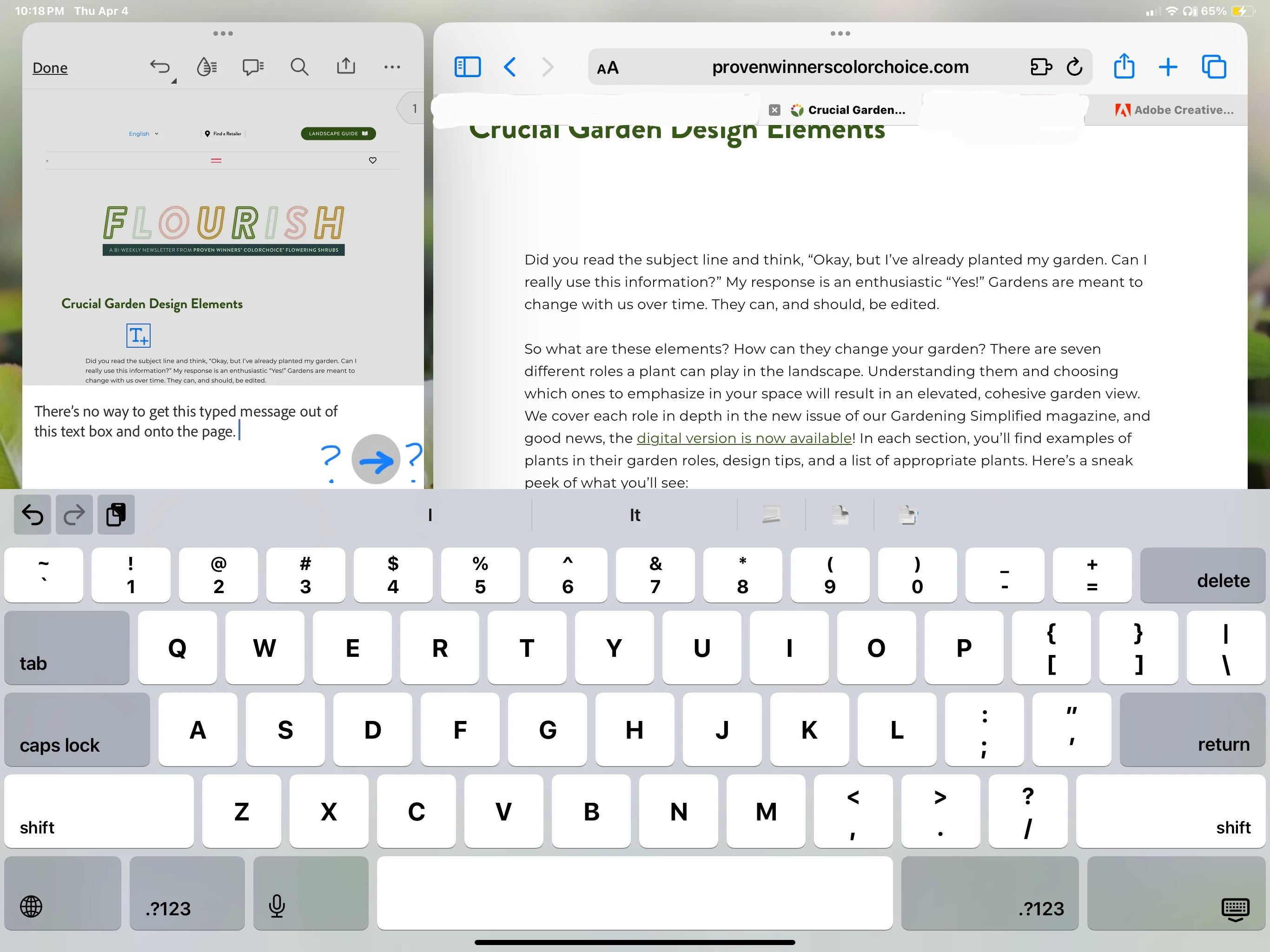 I use Acrobat Reader: Edit PDF's on an iPad. I've used this program for years without issue. After installing the most recent iOS update (17.4.1), I can no longer insert text into my PDF's. I can type into the text box, but the little, blue arrow that has always lived in the bottom, right corner of the text box is no longer there. There is no way to insert the typed text into the document. (I've included a screenshot.)