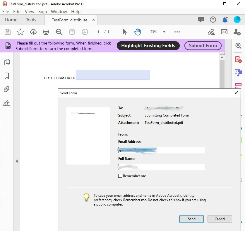 "Submit Button Breaks After Distributing". Created a form.pdf using acrobat DC. Added a button to submit a form on Mouse Up. Action is mailto:ParticularName@gmail.com. I preview the form and it works correctly. I save the form and open with Reader and it works correctly. When I Distribute the form so that I can have a Response file, the new form_distributed.pdf no longer works. Reader does not detect the button and adds its own Submit Form button with my account ID email address. And the submit button I created works but sends to the wrong email address. I have attached files to demonstrate this issue. Has anyone else experienced this behavior? Is it expected?