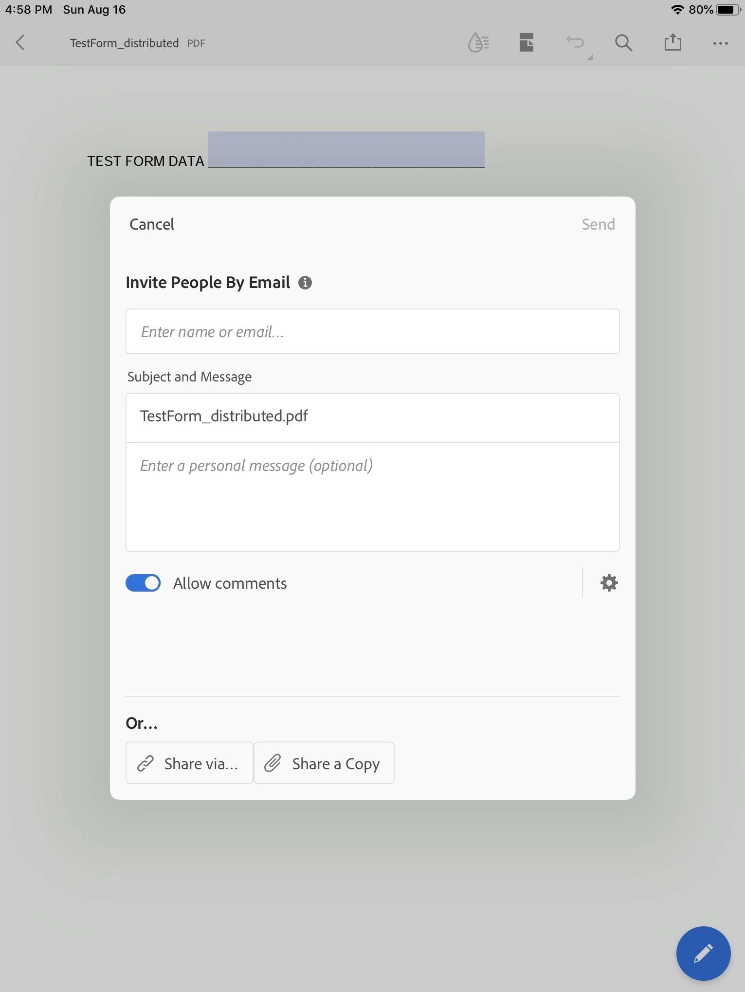 I experienced another example of "distributed" files not performing as described in the manuals. If a distrtibuted form posted on the web is opened "in another application, namely Adobe mobile" when downloaded with Chrome, or shared to Adobe mobile when downloaded with Safari, attempts to complete the form and then return by email result in an entirely different interface than when done on a desktop. Adobe Mobile treats it as an "invitation" to sign rather than the desktop's "submit form". Pictures attached. Is anyone else experiencing this behavior?