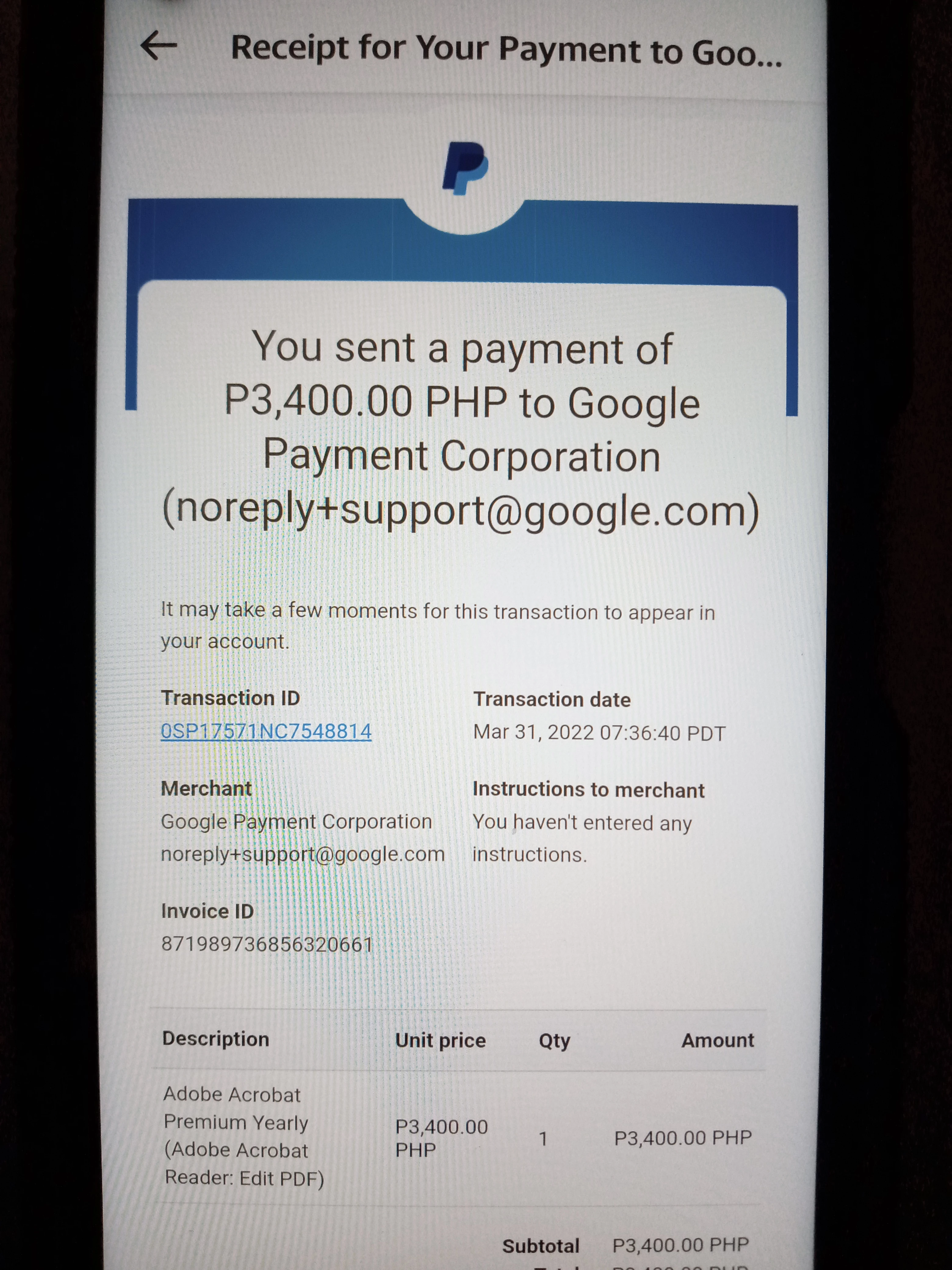 Last March 31, 2022 I was only trying to avail the 7 days free trial for Adobe Acrobat premium yearly but to my surprise Google already charged my paypal credit card for an annual fee of $68 or 3,400 pesos. Both PayPal and Google doesn't want to refund me eventhough I already send my intention for refund within the 7 days supposed to be free trial and I also cancelled the subscription already. I gave you 1 star and made a comment on the Google Play app for Adobe Acrobat last April 4, 2022. You replied just today and told me to go here at adobe.ly/readercommunity and told me you want to investigate and help resolve this. Kindly help me please. Thank you!