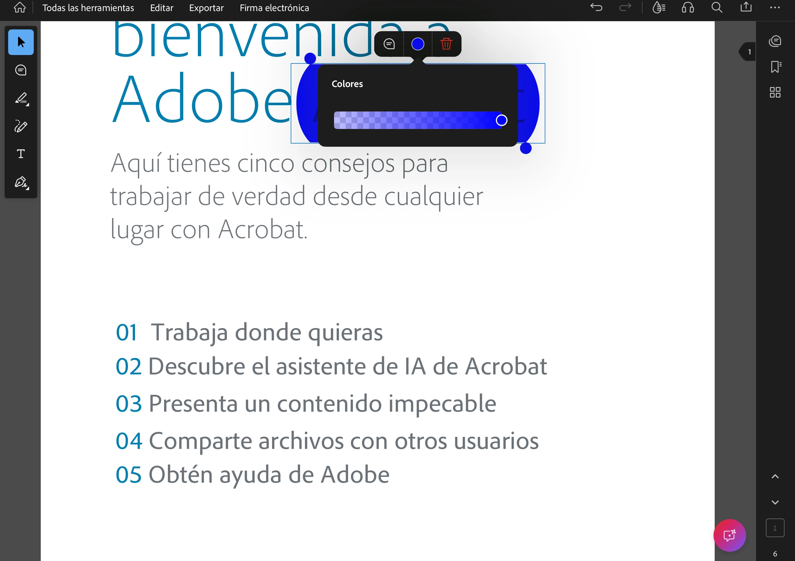 Abro un pdf con adobe, selecciono una parte de texto, le doy con el dedo a la selección y le doy a resaltar. Me resalta de color amarillo. Le doy de nuevo con el dedo al texto resaltado-resaltar-y solo me aparece el color amarillo y para poder cambiar la tonalidad de amarillo. No me salen más colores entre los que elegir. Si en el menu del lateral selecciono el icono de subrayar en vez del icono del puntero, ahí si me sale la paleta de colores entre los que escoger. Pero, igualmente, un texto que ya tenga resaltado no me deja desde el menu lateral cambiarle el color; si selecciono otro color, solo lo aplica al texto que vaya a seleccionar a continuación.