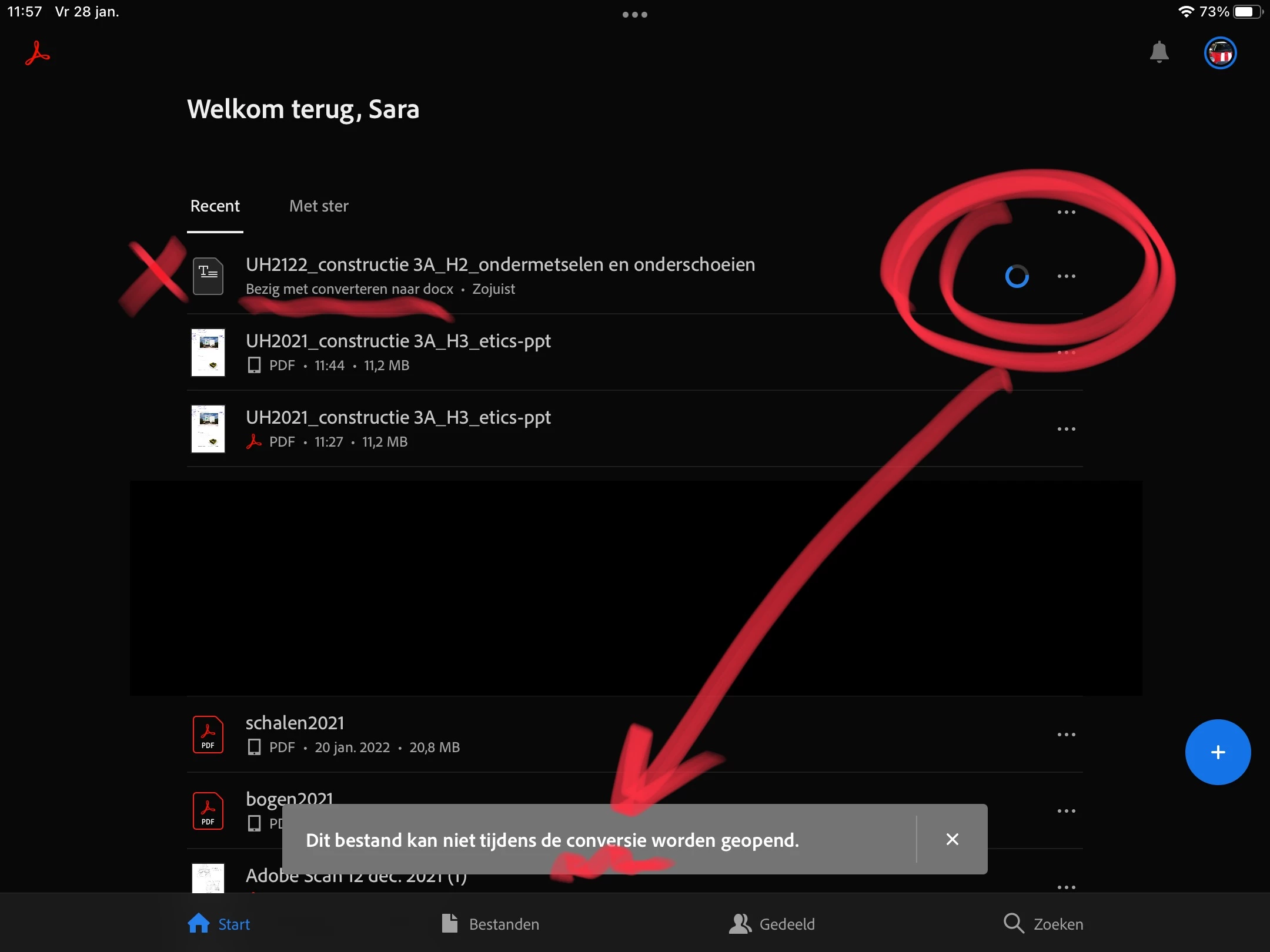 Voor school had ik de gewoonte om de cursus als pdf te openen in de app op mijn iPad. Dan nam ik notities erop of tekeningen en sloeg ik deze op. Na de les heb in perongeluk geduwd op converteren naar Word. Dit was niet de bedoeling. Nu enkele maanden later, is dat nog steeds aan het laden. Maar ik wil eigenlijk helemaal niet die Word-versie. Ik wil gewoon mijn pdf met nota's openen die ik op de iPad heb gemaakt. Het probleem is dat ik het bestand niet kan openen omdat het zogezegd bezig is met converteren. Maar dit blijft maar aan de gang en dit heeft geen zin. Hoe kan ik mijn bestand terug openen met de notities? Of het converteren stoppen?
