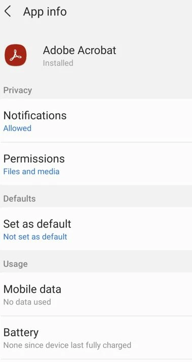Could you confirm that if you try to open any other PDF which is already saved on your mobile, does that ask which application you want to use to open it with? If yes, then select Acrobat and and then select "Always".