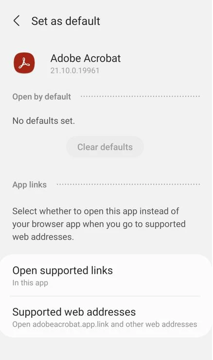 so I go into settings, tap the app, tap not set as default and there is nothing to change. Taping on open supported links is set to In this app. clear defaults greyed out. Nothing under supproted web addresses apart from some adobeacrobat links.