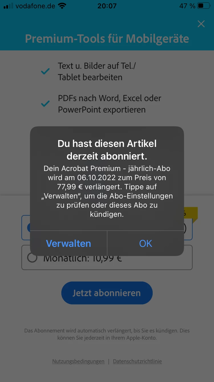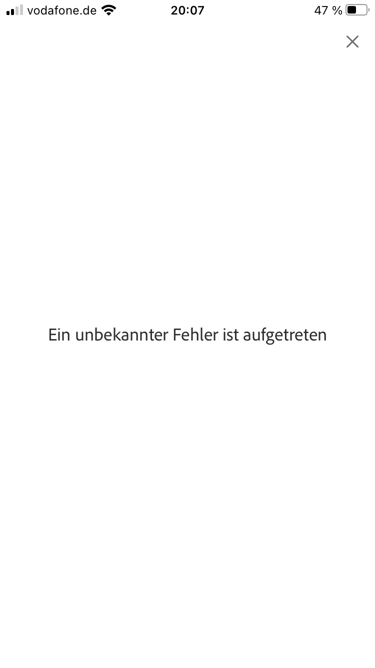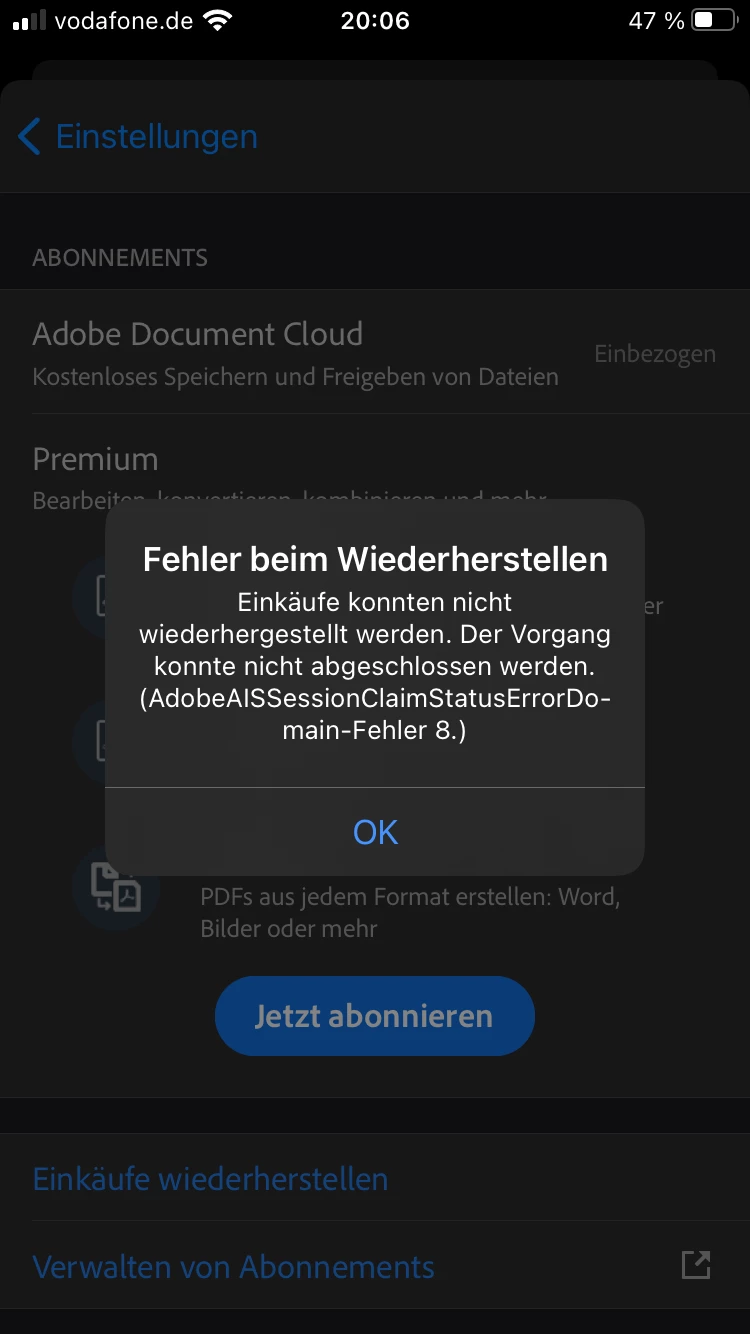 Ich hab von IOS die Adobe Acrobat App mit einem Premium Abonnement Mitte Novemver 2021 abgeschlossen. Nach kurzer Zeit konnte ich meine PDF-Dateien nicht mehr bearbeiten. Der Grund: Ich war auf einmal nur noch kostenloser Nutzer der App und kein Premium Kunde mehr. Als ich völlig erstaunt, trotz aller Bestätigungen von Kauf bis zur Lizenz des Premium Abos, erneut mein Abo abschließen klicken wollte, verweigerte es mir die App und zeigt mir stetig einen Fehlercode an. Dann werde ich auf eine Seite weiter geleitet worin nur wieder auf einen unbekannten Fehler verwiesen wird und ich befinde mich in einem Teufelskreis. Ich kann trotz Abschluss des Premium Abos nicht die Vorteile davon nutzen da die App von Adobe mich als kostenlosen Nutzer eingestuft hat. Was genau kann ich tun, bzw. kann mir jemand vom Kundenservice/Technikservice von Adobe behilflich sein? Anbei ein paar Bilder dazu.