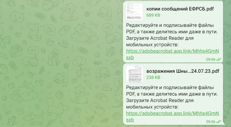При попытке поделиться файлом в виде отправки копии приложение автоматически с файлом отправляет рекламное сообщение: Редактируйте и подписывайте файлы PDF, а также делитесь ими даже в пути. Загрузите Acrobat Reader для мобильных устройств: https://adobeacrobat.app.link/Mhhs4GmNsxb