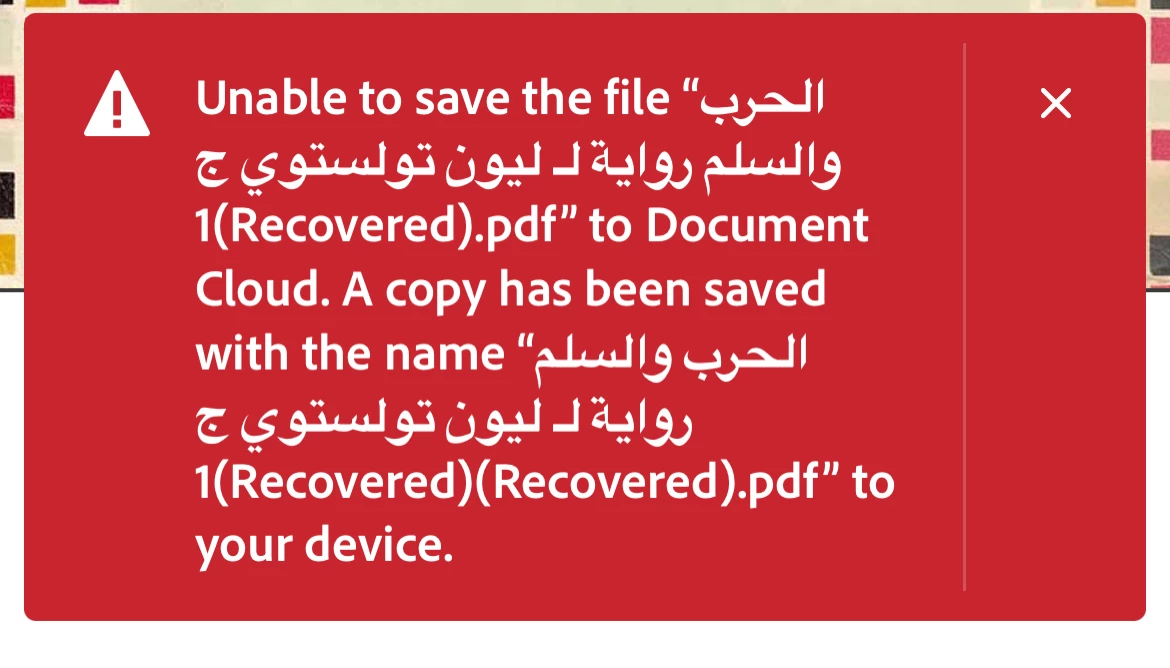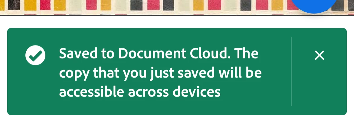 for almost one week, I am not permitted to save any PDF file to my document cloud. And every time, I receive a the same message, shows up in red color as alert, that I can only use the document on my device.