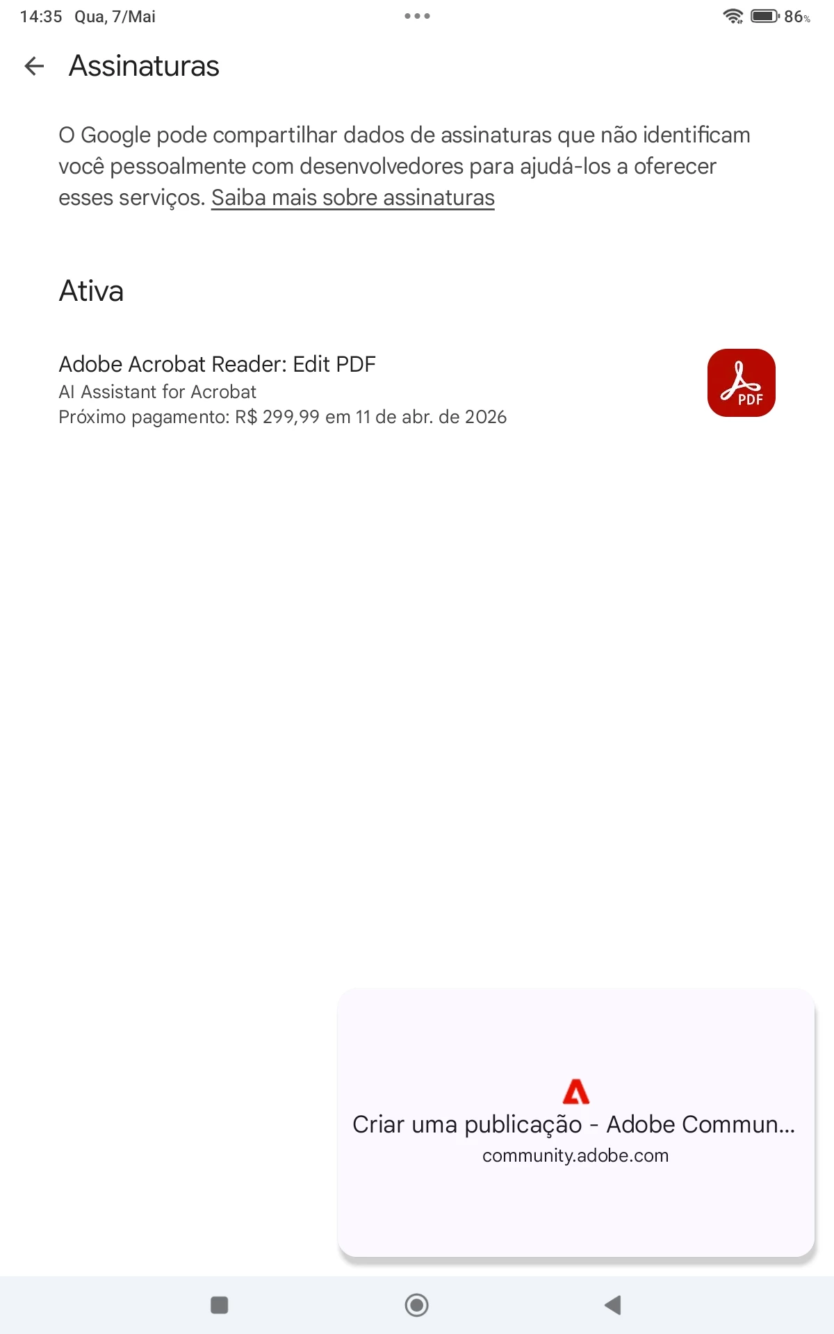 Ok, está inativa. Contudo, paguei R$299,00 por essa assinatura. Desta forma, fui obrigado a efetuar um novo pagamento, ou seja, R$22,99. Do contrário, ficaria sem acesso as principais ferramentas do Adobe Acrobat, bem como impossibilitado de editar os PDFs.