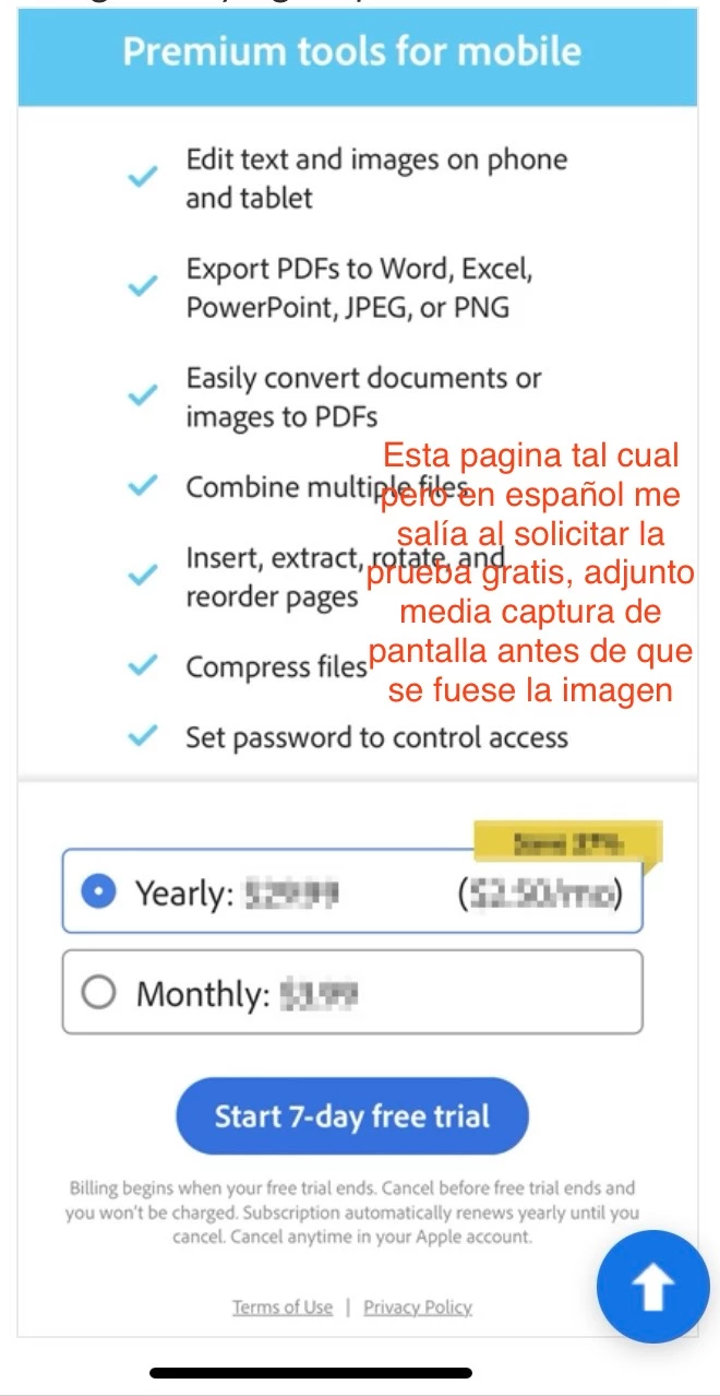 He solicitado hoy 17/04/2024 a la 1:03 a.m. Una prueba gratuitade 7 dias de adobe anual con mi iphone, mi sorpresa, a la 1:04 a.m me han cobrado el año entero mediante paypal. He cancelado la suscripcion a la 1:05 y he abierto disputas en apple y paypal para que me reembosen el dinero, pero me prece una estafa enormemente absoluta por parte de adobe, si prometen prueba gratuita de 7 dias, NO DEBEN COBRAR NADA HASTA QUE NO PASEN ESOS 7 DIAS! Espero que me reembolsen el dinero a la primera, pues estoy dispuesta a ir hasta a atencion al consumidor si no me resuelve nadie el problema.