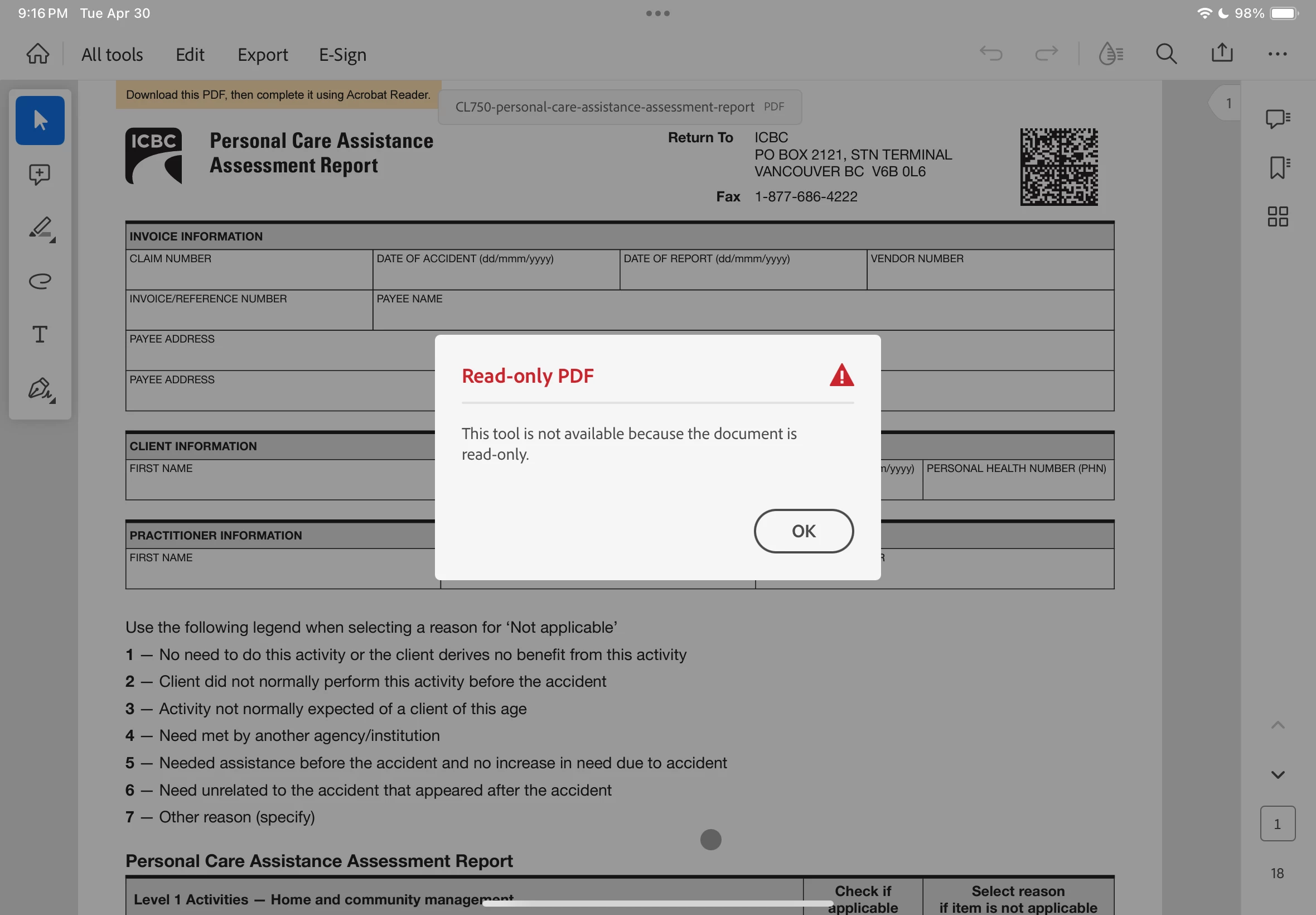 I am using an iPad with the latest version of the adobe reader app. I am trying to fill a PDF file and I am getting a read only error message. I use this same form on my iMAC using adobe reader and it works fine. Why can I not use the adobe app on the iPad to complete the form?