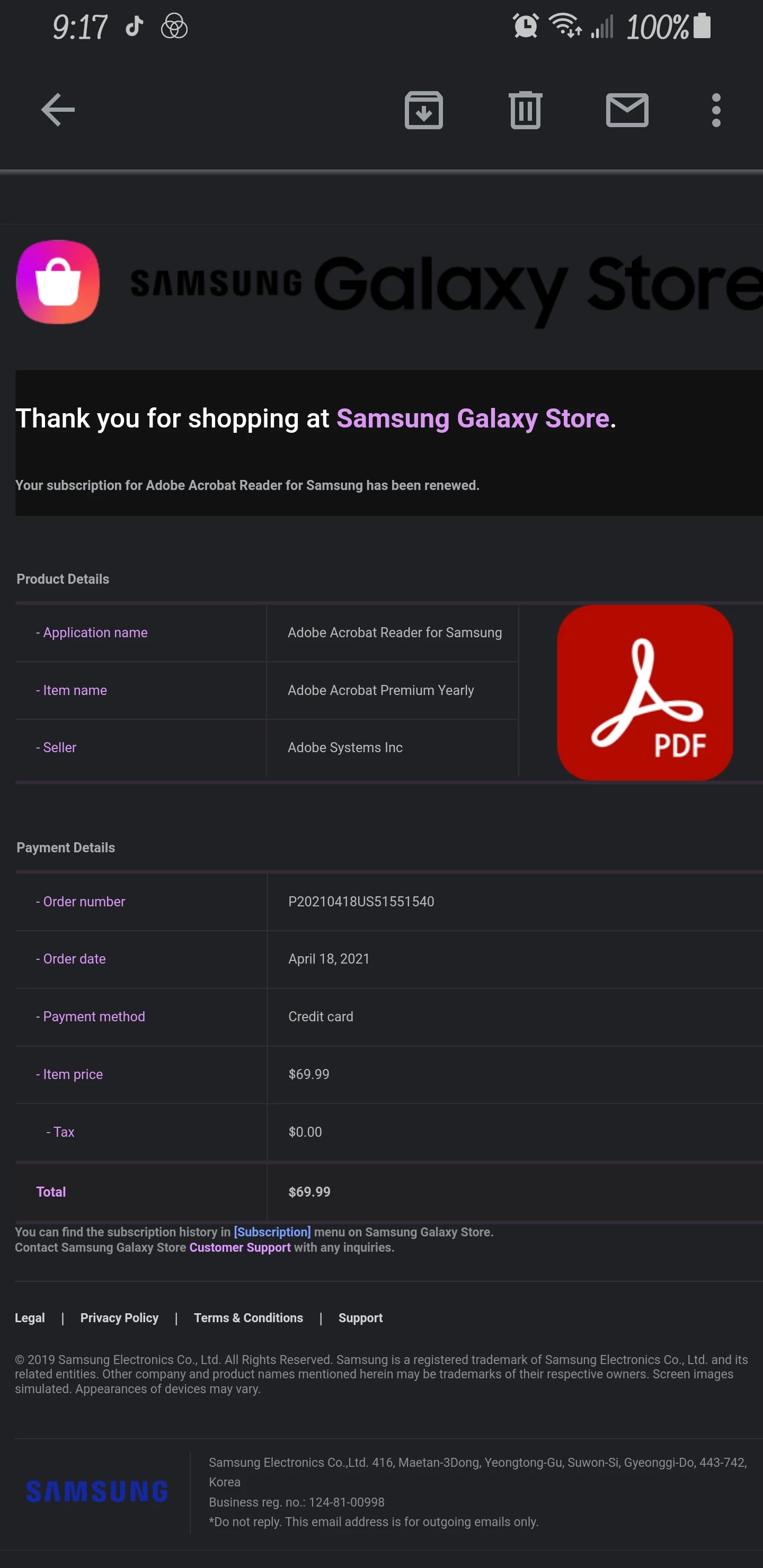 I have been corresponding between Samsung and Adobe since 04/18/2021. The latest email from Samsung stated: "Kindly note that a refund is only in order if you encountered an error while downloading the application and you were charged for it but you did not get it on the device, in case that an application that you purchased is not working or in other store related issues. In this case, since you can successfully use the content on the device, I would kindly inform you that unfortunately a refund is not in order."