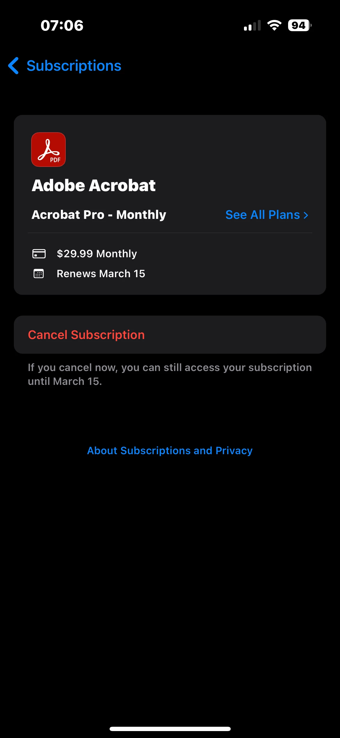 If this does not help, you may try restoring the purchase and check if it works. To learn more about how to do so, click here: Manage subscriptions — Acrobat for iOS Help (adobe.com)