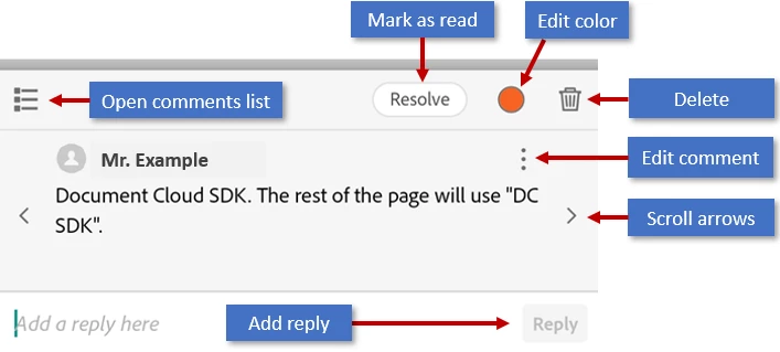 When you tap on a comment, the app shows the edit tools. From here you can: