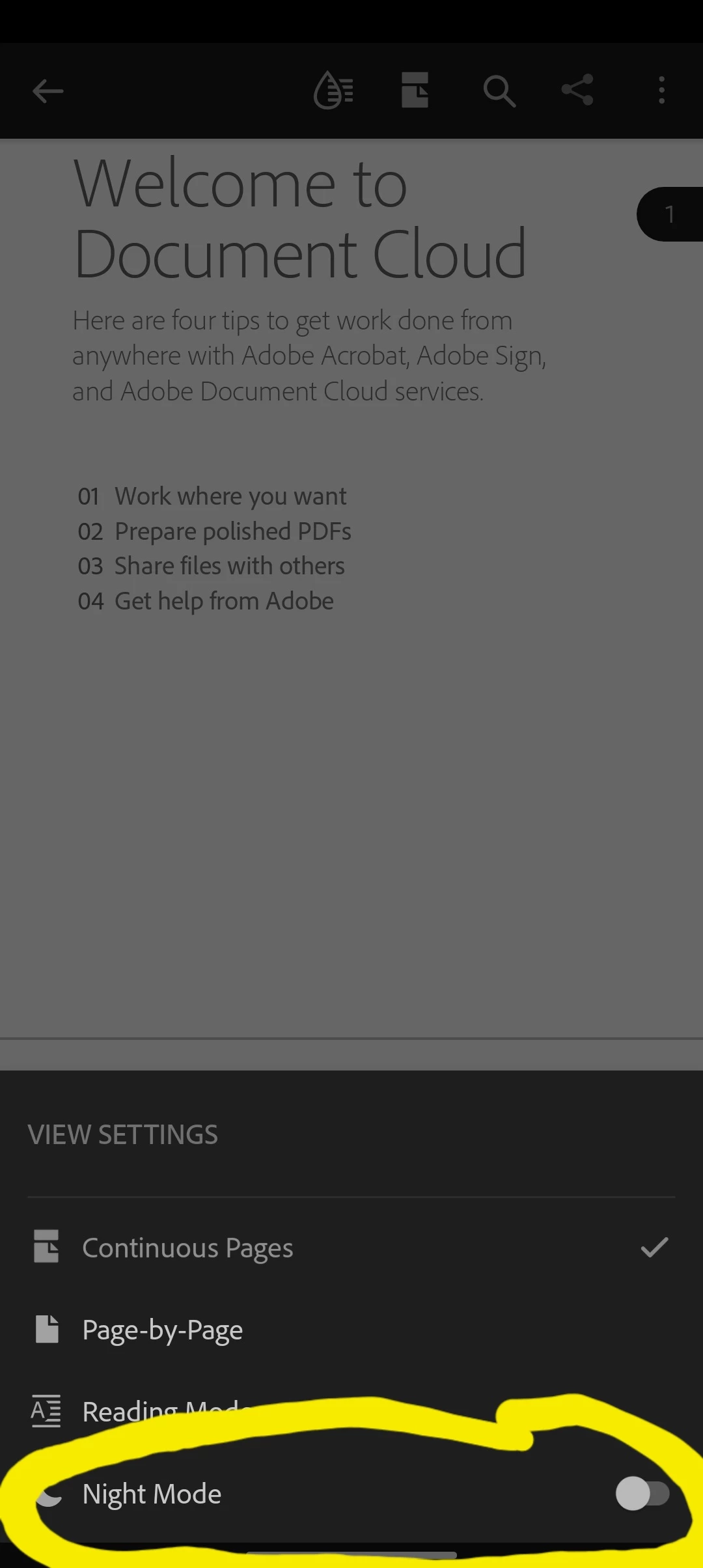Have you tried clicking the icon on the top right-hand side with two pages shown in half? On the menu, you will see a switch showing Night Mode from where you can disable it (attaching a screenshot for reference).