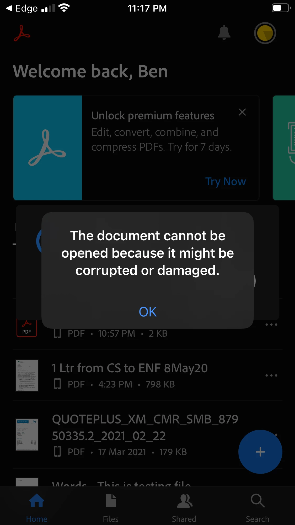 I often cannot open pdf documents in Acrobat Reader on my iPhone and iPad. I can view the pdf document in Edge browser, when I try to open the document in Acrobat Reader, the app prompts 'Downloading' and then prompts 'The document cannot be opened because it might be corrupted or damaged'.