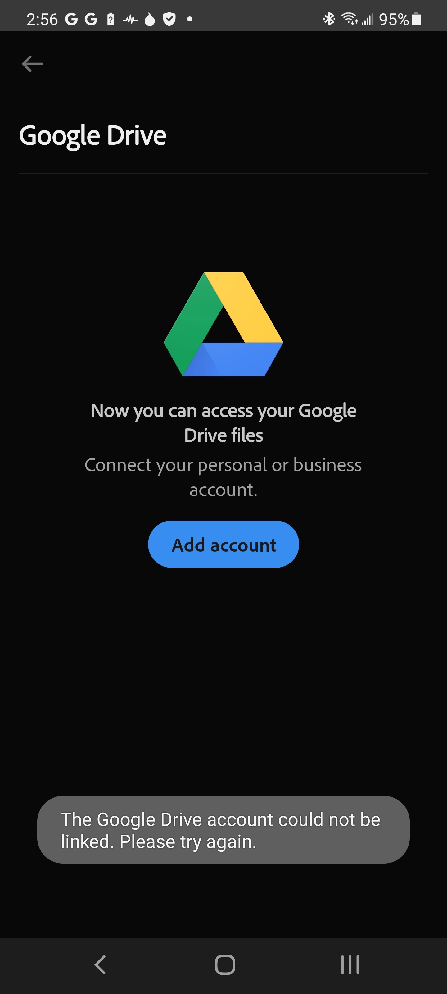 I have an android Samsung phone S21 Ultra unrooted. I have sync enabled for a google account on my S21 Ultra and so I'm trying to sync it with the free Acrobat Adobe app as I do sign in with that google account into Adobe so I go to 'save a copy' in the '3 dot icon' at the right of a PDF I have in Adobe and then choose the google account I want it to sync with when it arrives at the page saying 'Now you can access your google drive files. Connect your personal or business account." But when I then press the 'Add Account' button it says 'The google drive account could not be linked. Please try again.' without doing anything. I did enable all the persimission for both Adobe app and google drive app. Will Adobe suppport help me fix this? Because the words 'The google drive account could not be linked. Please try again.' don't have anything showing in google.