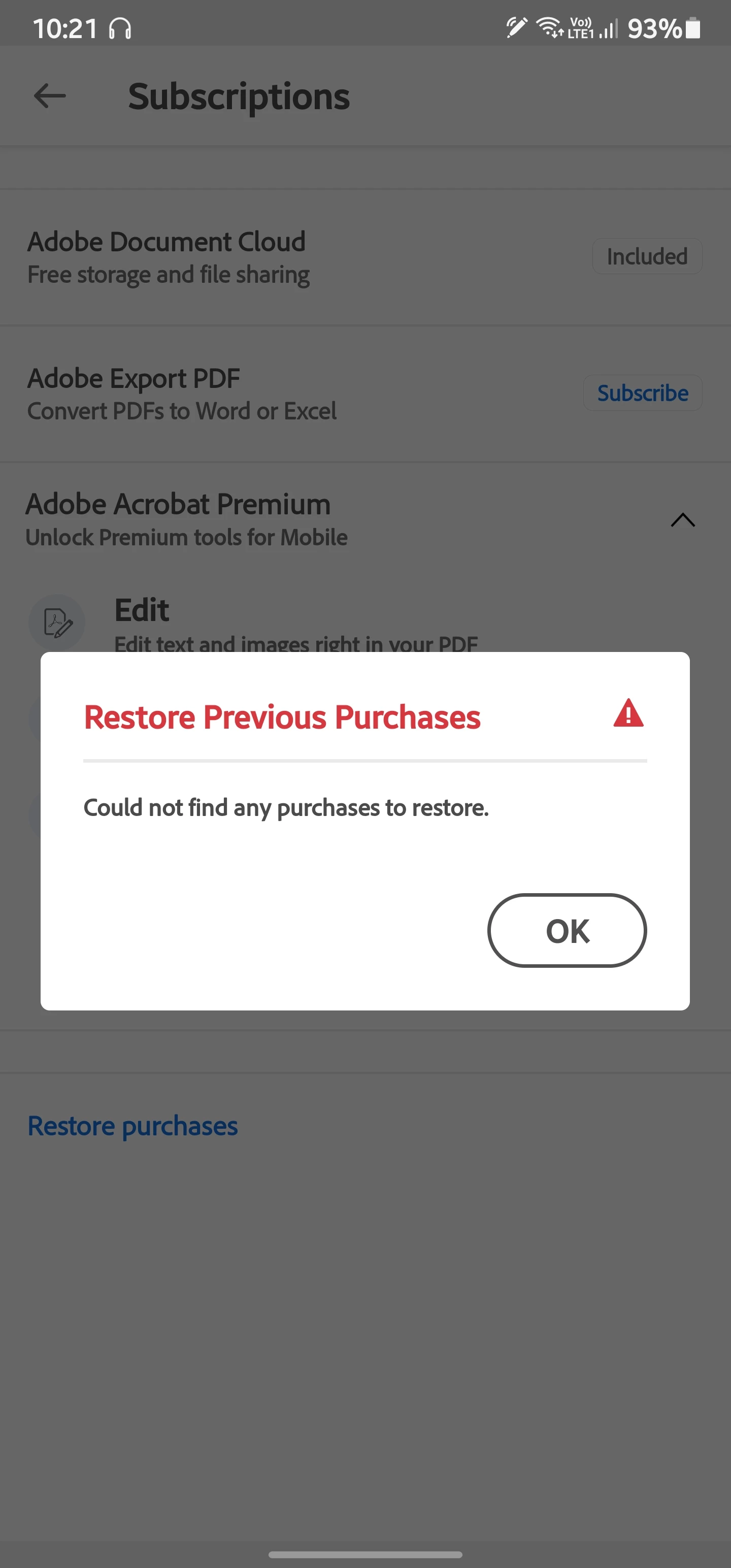 I click restore purchase in the adobe acrobat but this massage appears