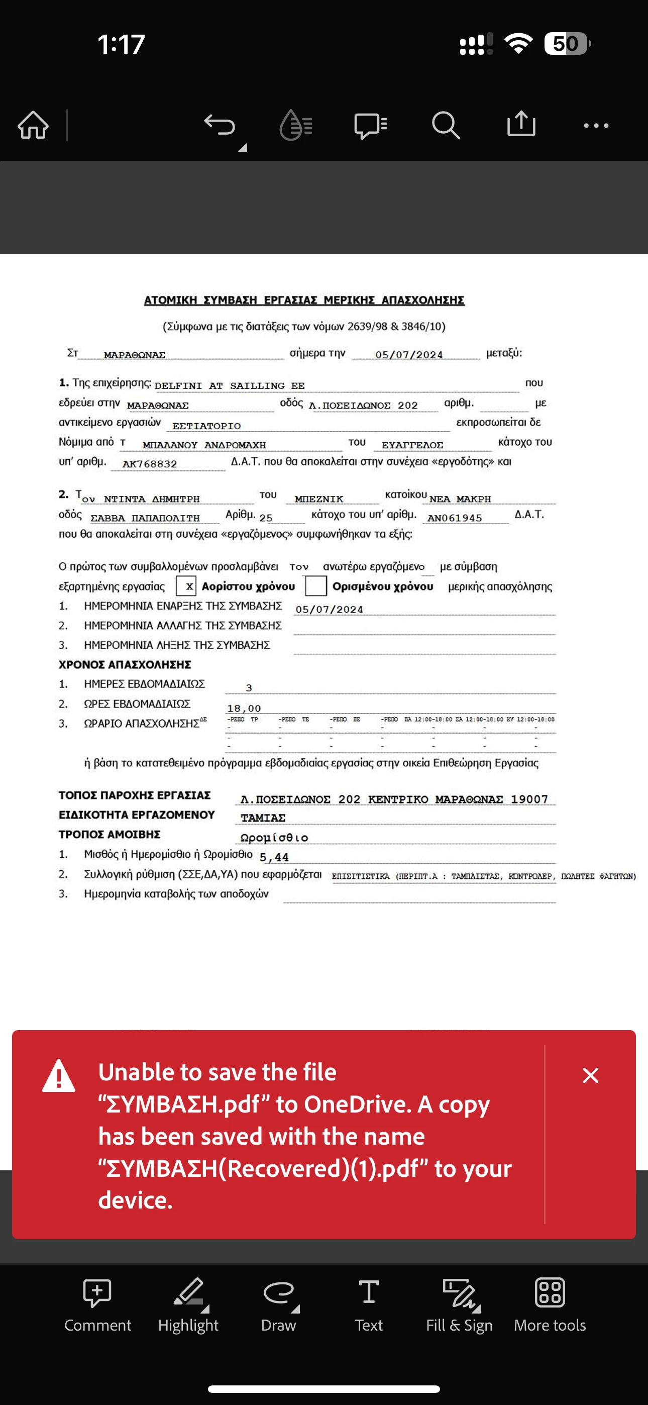 Could you please provide more details about the workflow or steps you're using to save the PDF to OneDrive? If you're using the 'Copy to' option within the Acrobat Reader mobile application, try removing the OneDrive storage from the app, rebooting your device, and then adding the OneDrive storage back to the Acrobat Reader Mobile app. This might resolve the issue.