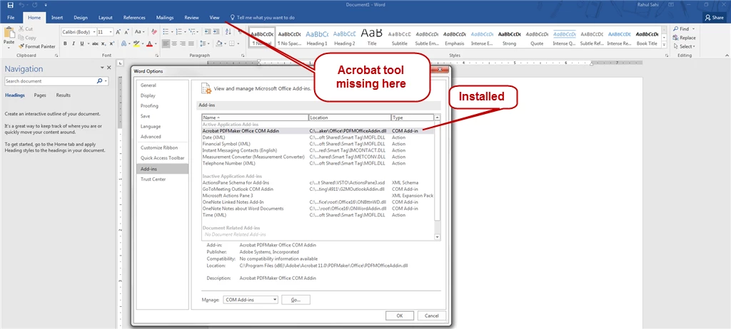 Issue: Acrobat tab is not visible in MS Word. I am able to convert a word doc to PDF from File>export to PDF or Save as PDF, but this way I am loosing on Navigation stuff, to keep the PDF version intact I have always used the tool since I updated office. On a diff. computer when I use the Acrobat tab to create PDF I am getting expected results. I have tried following solution:
