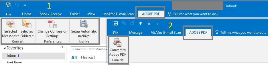 If you referring to the options which appear when you open the email , then i want to mention that when you open outlook , you can see the Adobe PDF options but when you open any email you will not see the same option.