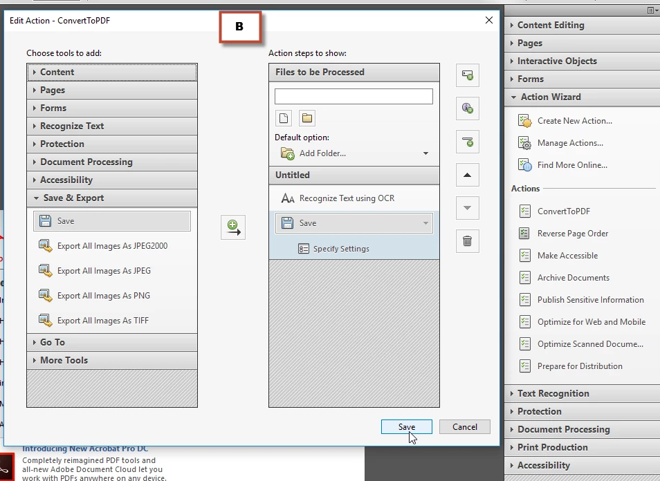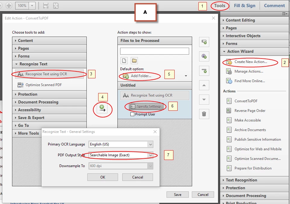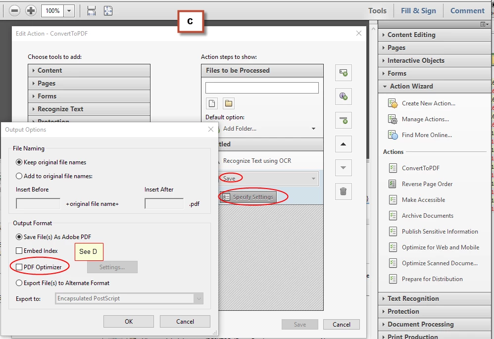I tried(!) to create an action myself and believe it is working, but I can't add it to the context menu have Acrobat run in the background.