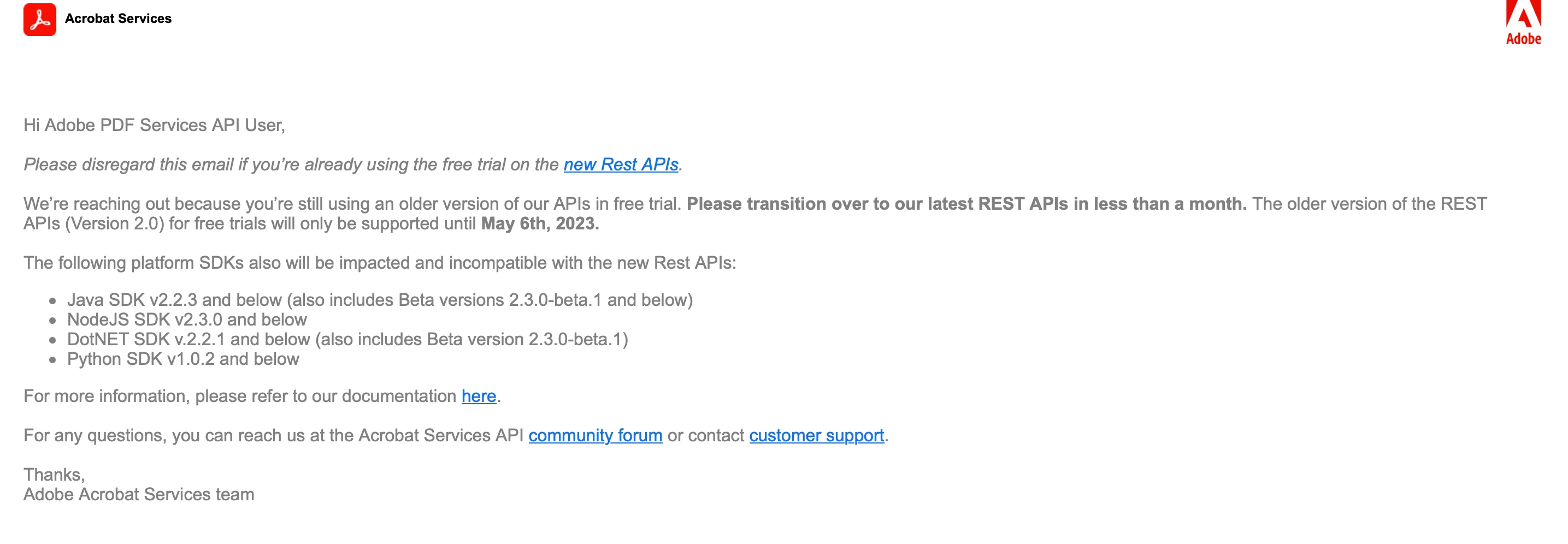 I have received this email regarding updating apis for cloud apis, I am using npm package https://www.npmjs.com/package/@adobe/pdfservices-node-sdk