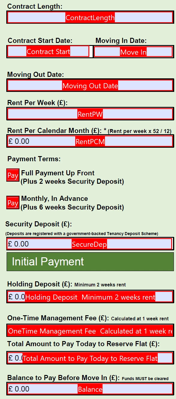 If the Security Deposit is 2 weeks, then the Balance to Pay will be ContractLength * RentPCM