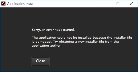 The application could not be installed because the installer file is damaged. Try obtaining a new installer file from the application author.