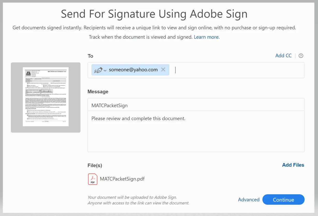 Adobe Send automatically populates To: field.
