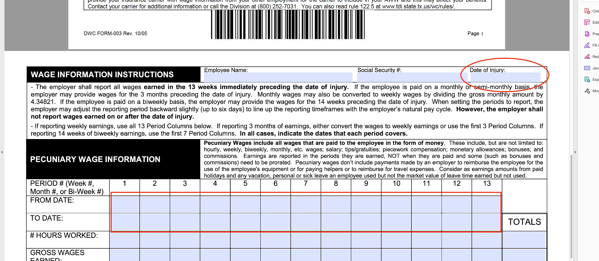 I believe the last "TO DATE" is the Monday prior to the Date of Injury. And then all the other dates work backward from there. (So each from/to dates need to be Mon-Sun)