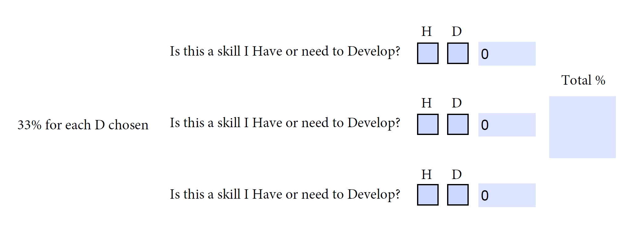 A user chooses if they Have or Need to Develop a skill. Each H chosen passes a 0. Each D chosen passes a 1 and calculates the % total. 0/33/66/100 is possible. Each H and D need a different box name, like Have1 and Develop1 and so on through possibly 300 skill levels.