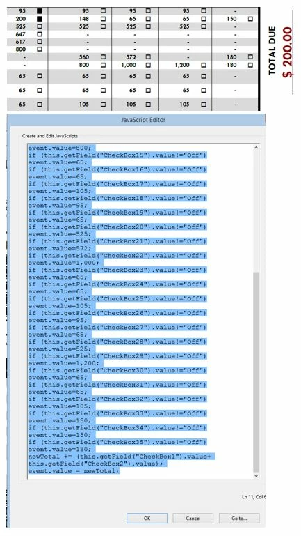 if (this.getField("CheckBox1").value!="Off")event.value=95; if (this.getField("CheckBox2").value!="Off")event.value=200; if (this.getField("CheckBox3").value!="Off")event.value=525; if (this.getField("CheckBox4").value!="Off")event.value=647; if (this.getField("CheckBox5").value!="Off")event.value=617; if (this.getField("CheckBox6").value!="Off")event.value=800; if (this.getField("CheckBox7").value!="Off")event.value=65; if (this.getField("CheckBox8").value!="Off")event.value=65; if (this.getField("CheckBox9").value!="Off")event.value=65; if (this.getField("CheckBox10").value!="Off")event.value=95; if (this.getField("CheckBox11").value!="Off")event.value=148; if (this.getField("CheckBox12").value!="Off")event.value=525; if (this.getField("CheckBox13").value!="Off")event.value=560; if (this.getField("CheckBox14").value!="Off")event.value=800; if (this.getField("CheckBox15").value!="Off")event.value=65; if (this.getField("CheckBox16").value!="Off")event.value=65; if (this.getField("CheckBox17").value!="Off")event.value=105; if (this.getField("CheckBox18").value!="Off")event.value=95; if (this.getField("CheckBox19").value!="Off")event.value=65; if (this.getField("CheckBox20").value!="Off")event.value=525; if (this.getField("CheckBox21").value!="Off")event.value=572; if (this.getField("CheckBox22").value!="Off")event.value=1,000; if (this.getField("CheckBox23").value!="Off")event.value=65; if (this.getField("CheckBox24").value!="Off")event.value=65; if (this.getField("CheckBox25").value!="Off")event.value=105; if (this.getField("CheckBox26").value!="Off")event.value=95; if (this.getField("CheckBox27").value!="Off")event.value=65; if (this.getField("CheckBox28").value!="Off")event.value=525; if (this.getField("CheckBox29").value!="Off")event.value=1,200; if (this.getField("CheckBox30").value!="Off")event.value=65; if (this.getField("CheckBox31").value!="Off")event.value=65; if (this.getField("CheckBox32").value!="Off")event.value=105; if (this.getField("CheckBox33").value!="Off")event.value=150; if (this.getField("CheckBox34").value!="Off")event.value=180; if (this.getField("CheckBox35").value!="Off")event.value=180;
