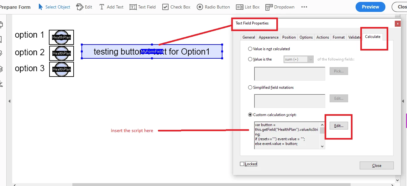 If a user chooses Button 1, I would like the text in myFormField to change to "Button 1"